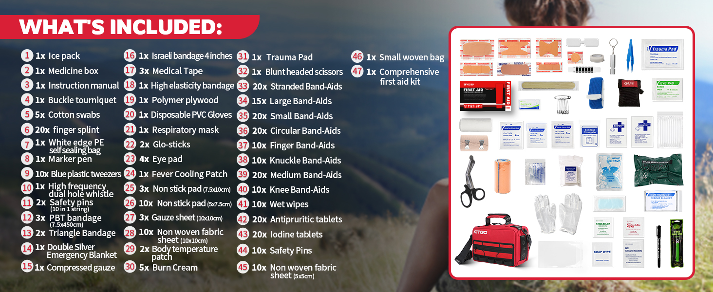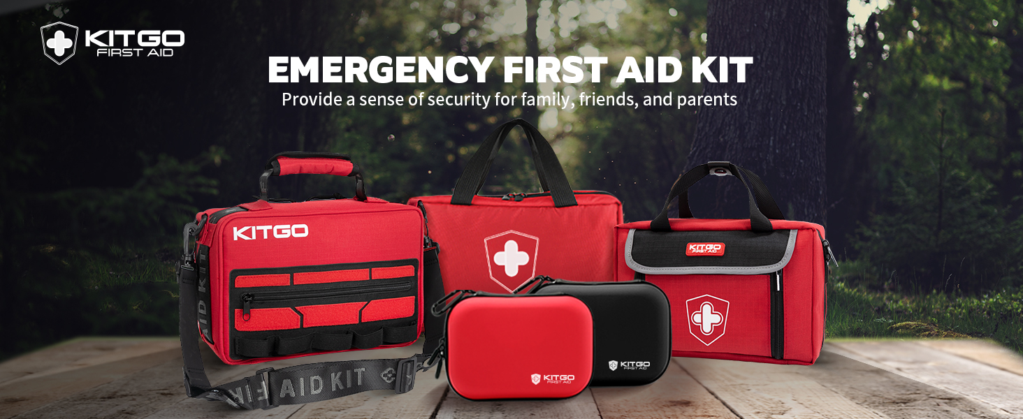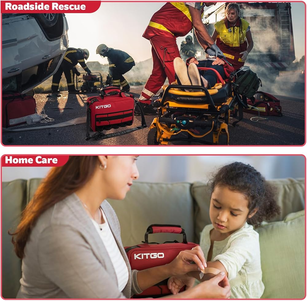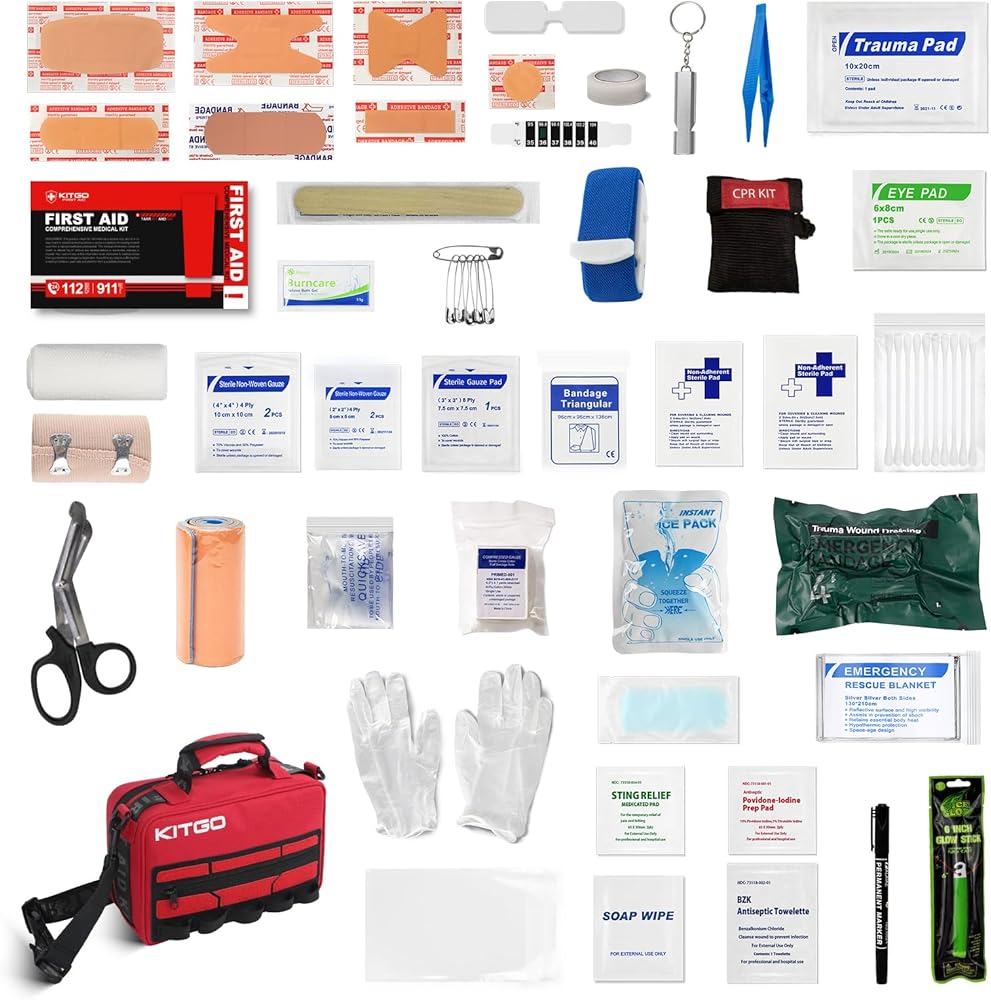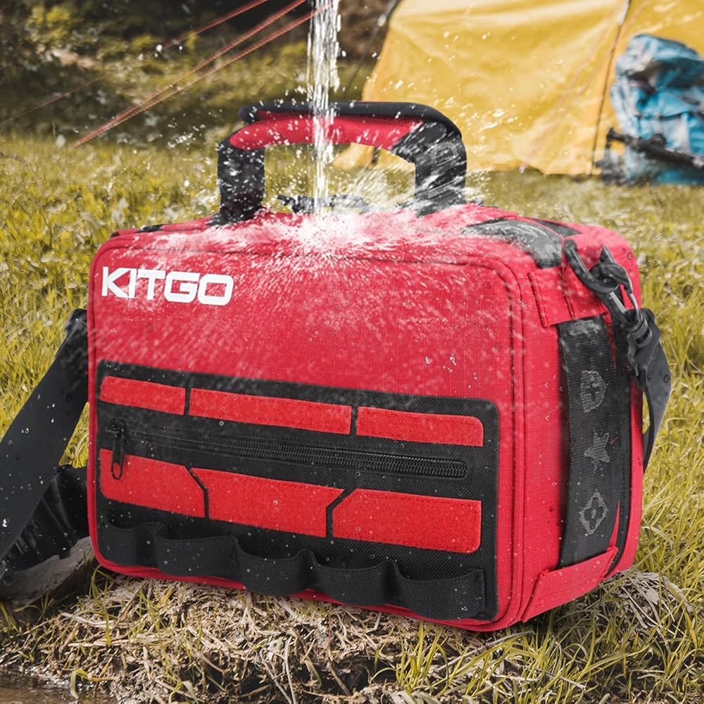 • مستلزمات الطوارئ: تحتوي مجموعة الإسعافات الأولية الشاملة من Kitgo على إجمالي 426 من لوازم الإسعافات الأولية الاحترافية. تُستخدم الضروريات الموجودة في مجموعة الإسعافات الأولية للعناية بالخدوش البسيطة والجروح والحروق وما إلى ذلك. تحتوي مجموعة الإسعافات الأولية على ضمادات وعاصبة وضمادات وبطانيات طوارئ وكمادات ثلج وما إلى ذلك.