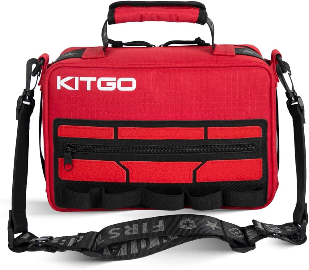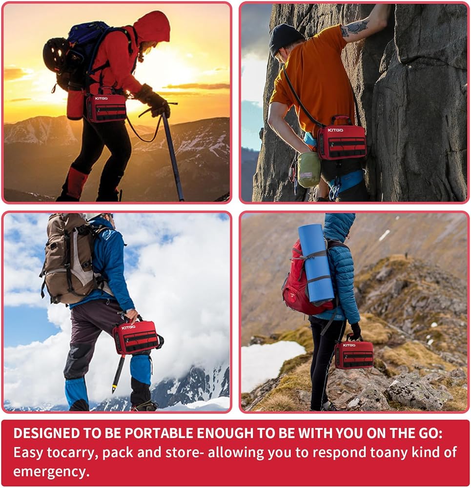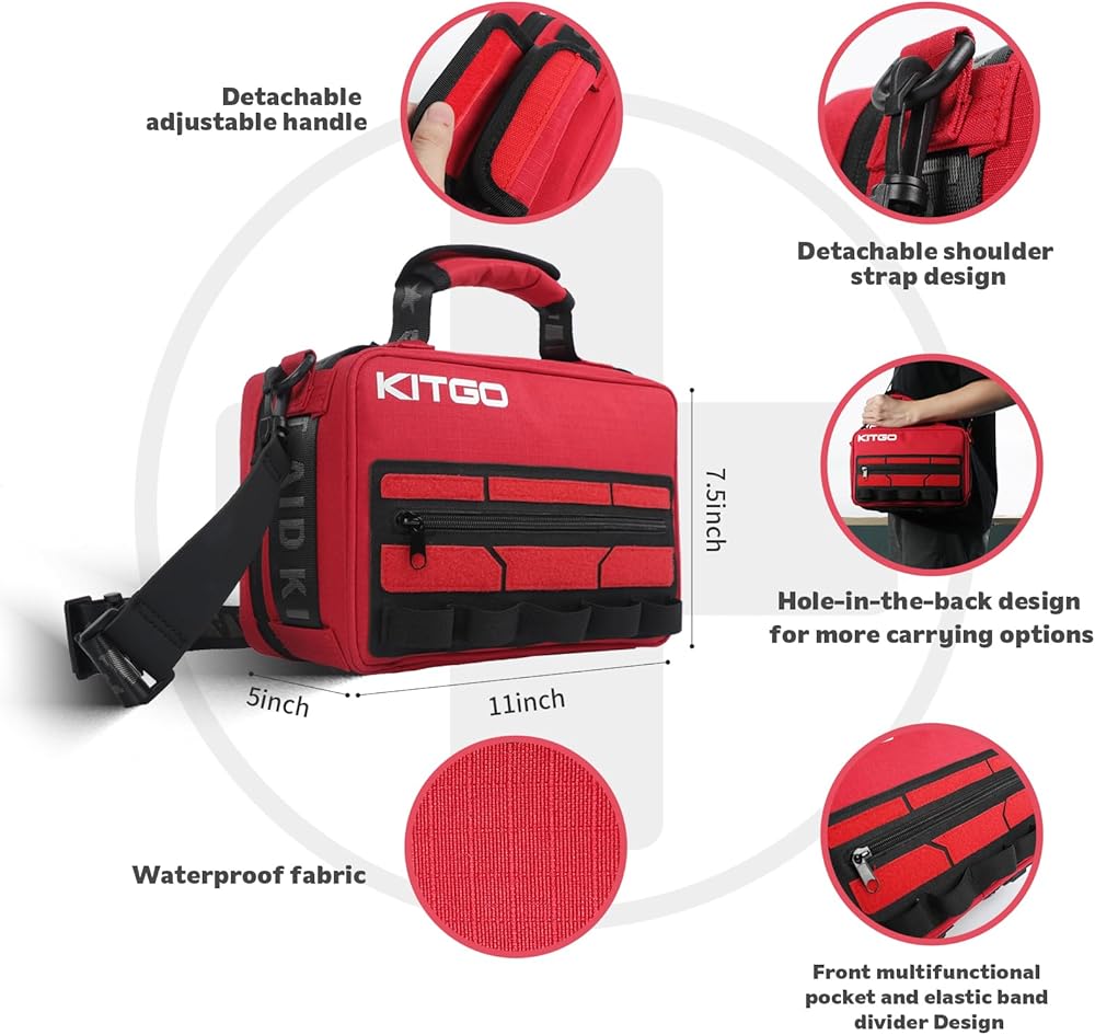 • مجموعة الإسعافات الأولية المحمولة: يبلغ حجم مجموعة الإسعافات الأولية العملية من Kitgo 7.5*10.5*4.5 بوصة فقط وتزن 2.8 رطل فقط. وهي مجهزة بحزام كتف متوافق ويمكن تعليقها على حقيبة الظهر أو الخصر بطرق ارتداء متعددة. مناسبة جدًا للحمل أثناء التنقل.