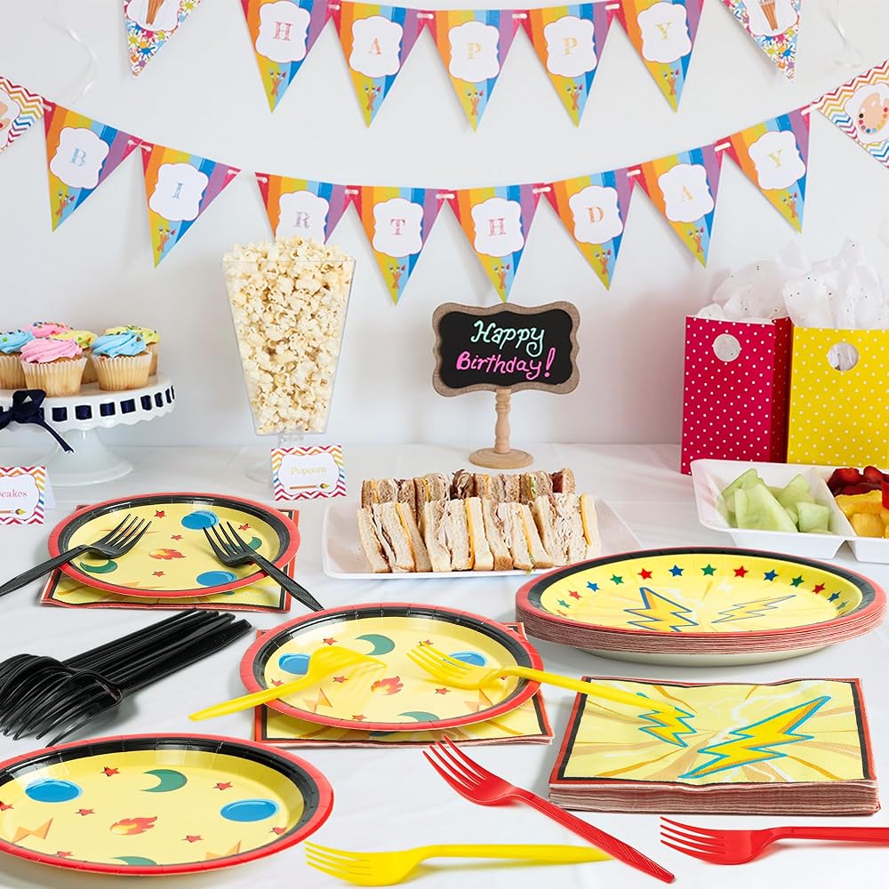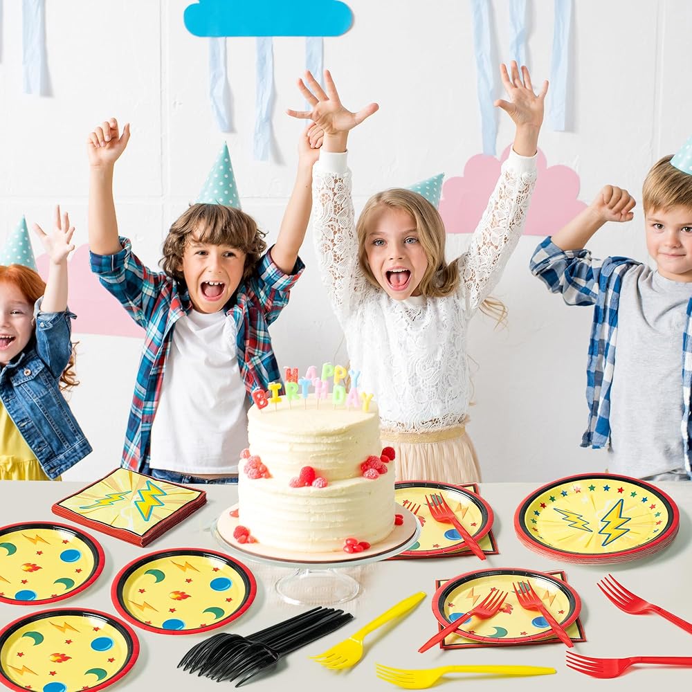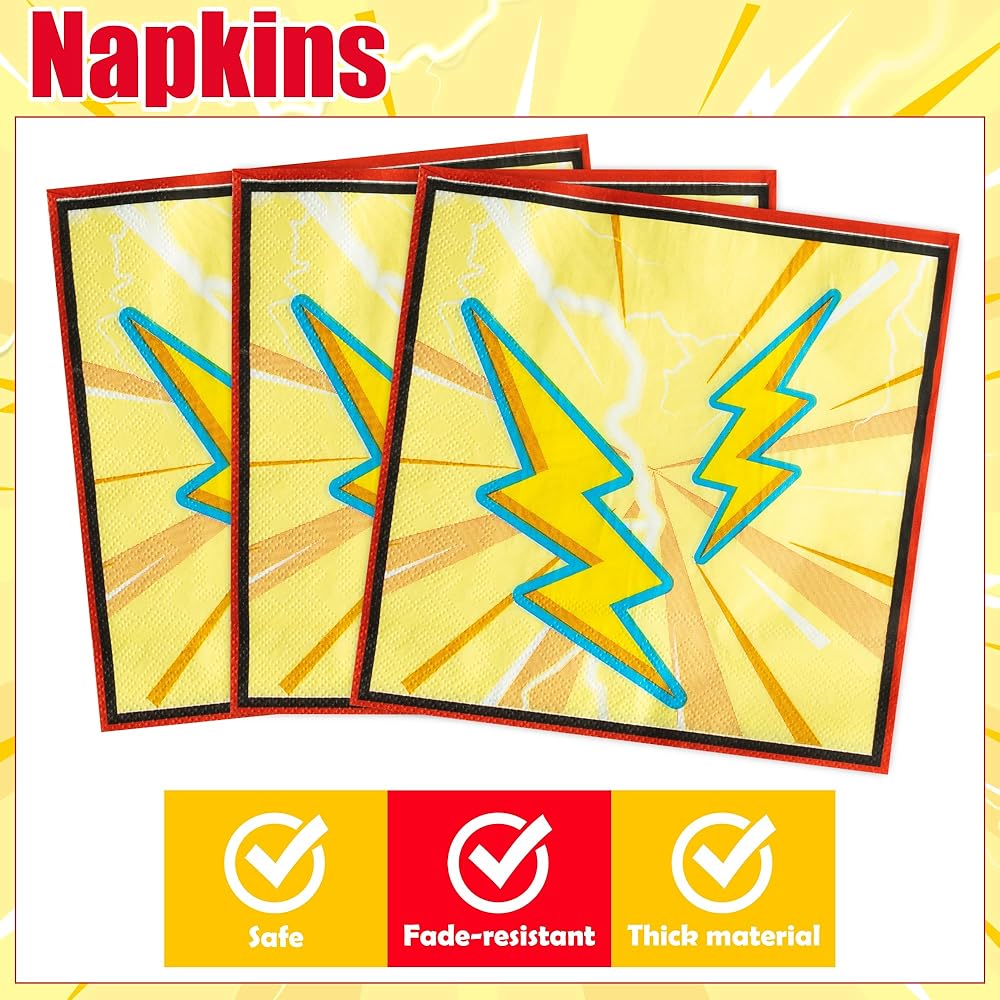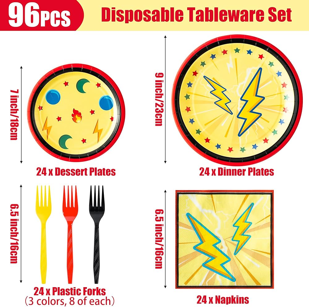 • Great Value Set:Package includes 24 cartoon lightning bolts themed party dinner plates (9 in) , 24 cartoon lightning bolts themed party dessert plates (7 in) , 24 cartoon lightning bolts themed party napkins (6.5 in) , 24 plastic forks (8 each black, yellow and red) , this set can serve 24 guests.