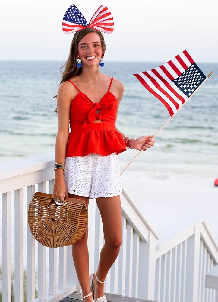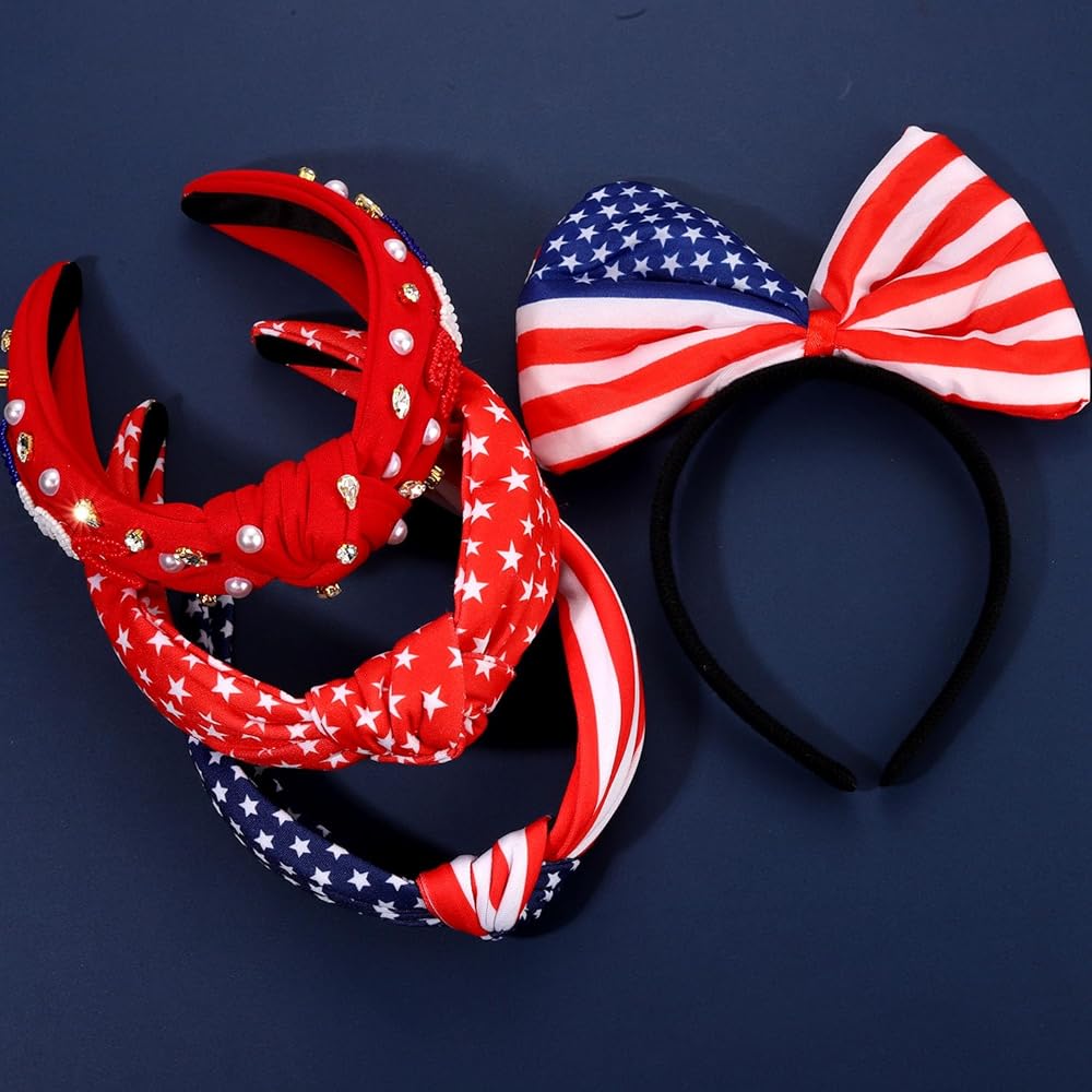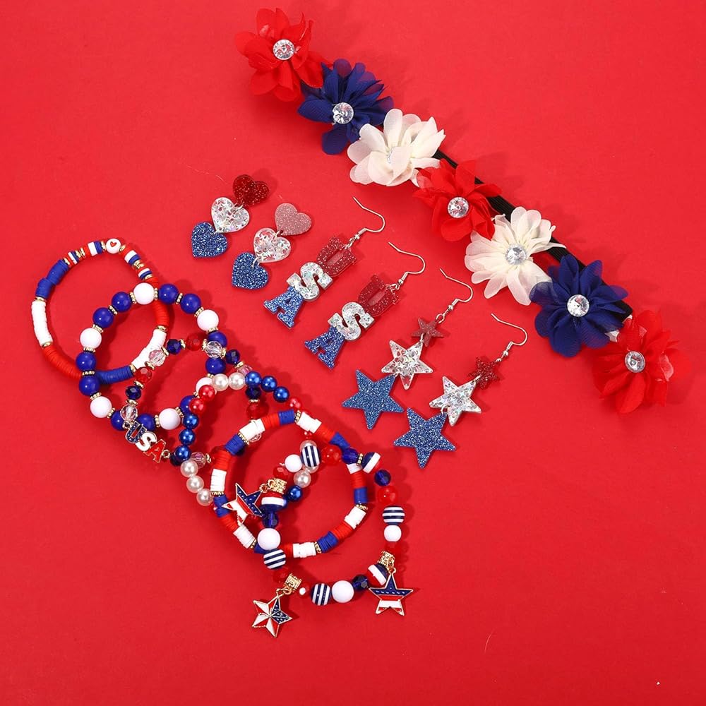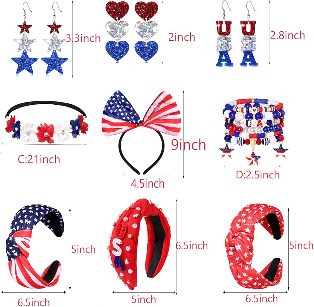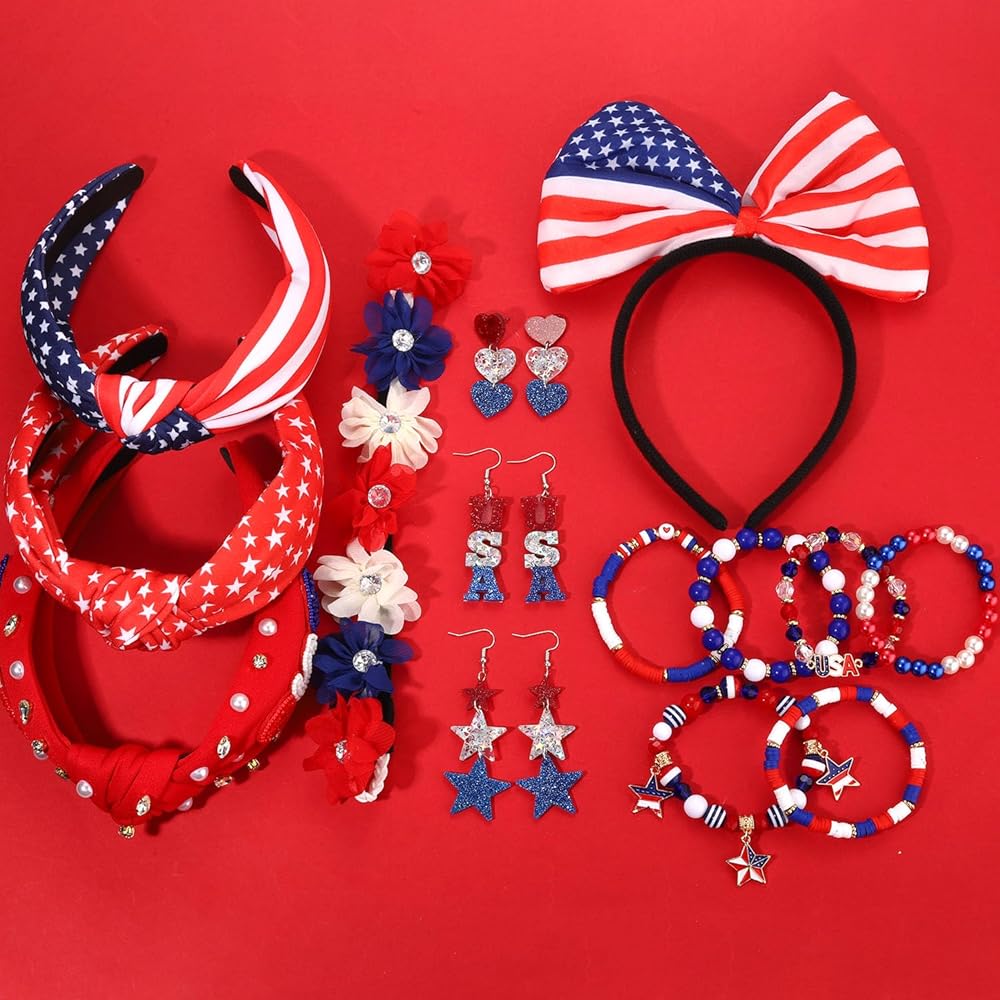 إكسسوارات وطنية للنساء: سوف تحصل على 9 قطع من إكسسوارات المجوهرات الوطنية في الرابع من يوليو، بما في ذلك قطعة واحدة من غطاء رأس هالة تاج على شكل زهرة حمراء وبيضاء وزرقاء، وقطعة واحدة من طوق الشعر على شكل فيونكة وطنية، و3 قطع عصابة رأس عمامة ذات عقدة علوية واسعة، و3 أزواج بطابع الرابع من يوليو أقراط وأساور مطرزة بالعلم الأمريكي. ألوانها الرئيسية هي الأحمر الكلاسيكي والأزرق والأبيض، وهي مثالية للاحتفالات بعيد الاستقلال في الرابع من يوليو