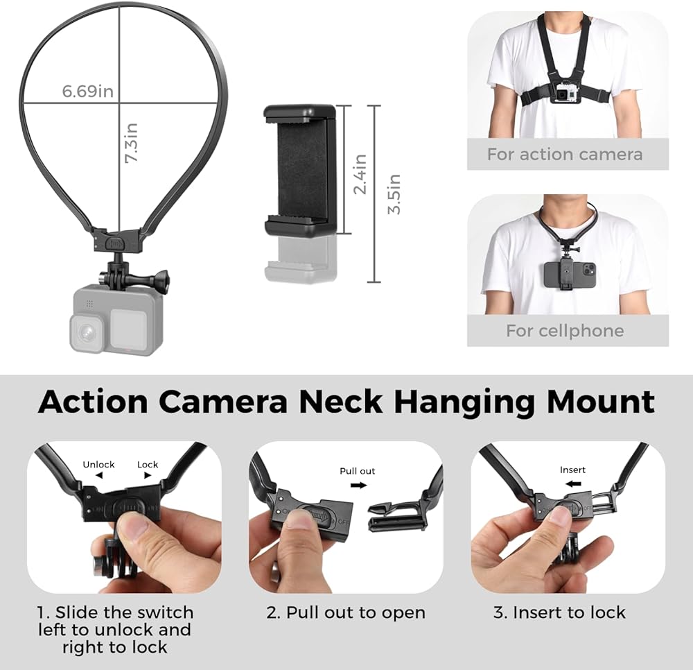 Varku 3-in-1 Action Camera Selfie Mount Kit، POV Selfie على الصدر وحزام الرأس ودعامة تعليق للرقبة، مجموعة حاملات دعم الهاتف وكاميرا فيديو Vlog بدون استخدام اليدين Hero/Insta360/Xiaomi Tripod