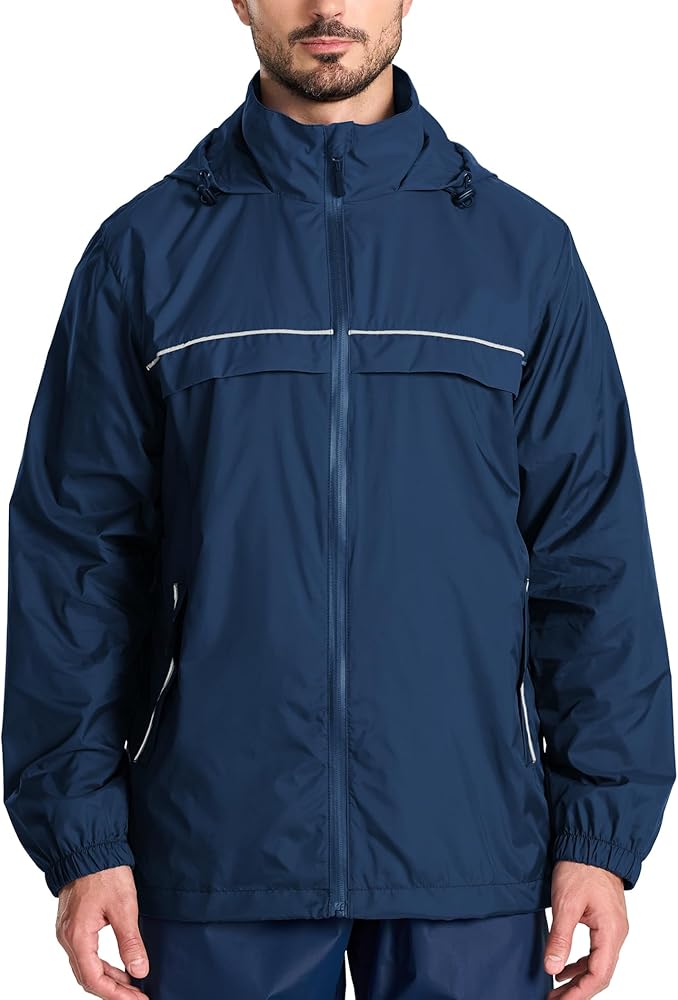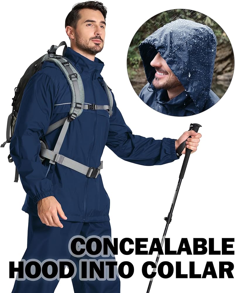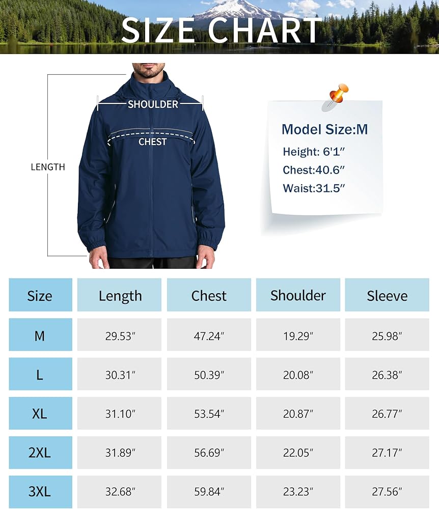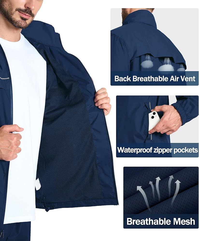 Windbreaker: سترات المطر الرجالية المقاومة للماء مع غطاء رأس تتميز برباط لضبط العرض والارتفاع، وتضيف مزيدًا من الحماية والدفء؛ حاشية برباط قابل للتعديل وأساور أكمام مرنة تمنع الرياح الباردة وتوفر ملاءمة مرنة. يوفر غطاء العاصفة الأمامي وواقي الذقن المبطن المزيد من الراحة