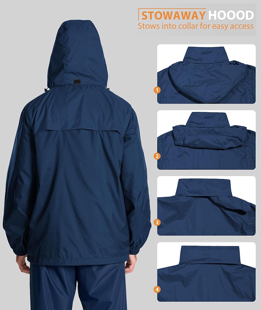 غطاء رأس قابل للتخزين: تأتي معاطف المطر للرجال مع غطاء رأس قابل للتخزين لتلبية الاحتياجات المختلفة. من السهل الاحتفاظ بها في حقيبة يدك أو حقيبة السفر أو حقيبة السفر أو السيارة. لقد تم تصميمه بذكاء للسماح بالحد الأدنى من شغل المساحة