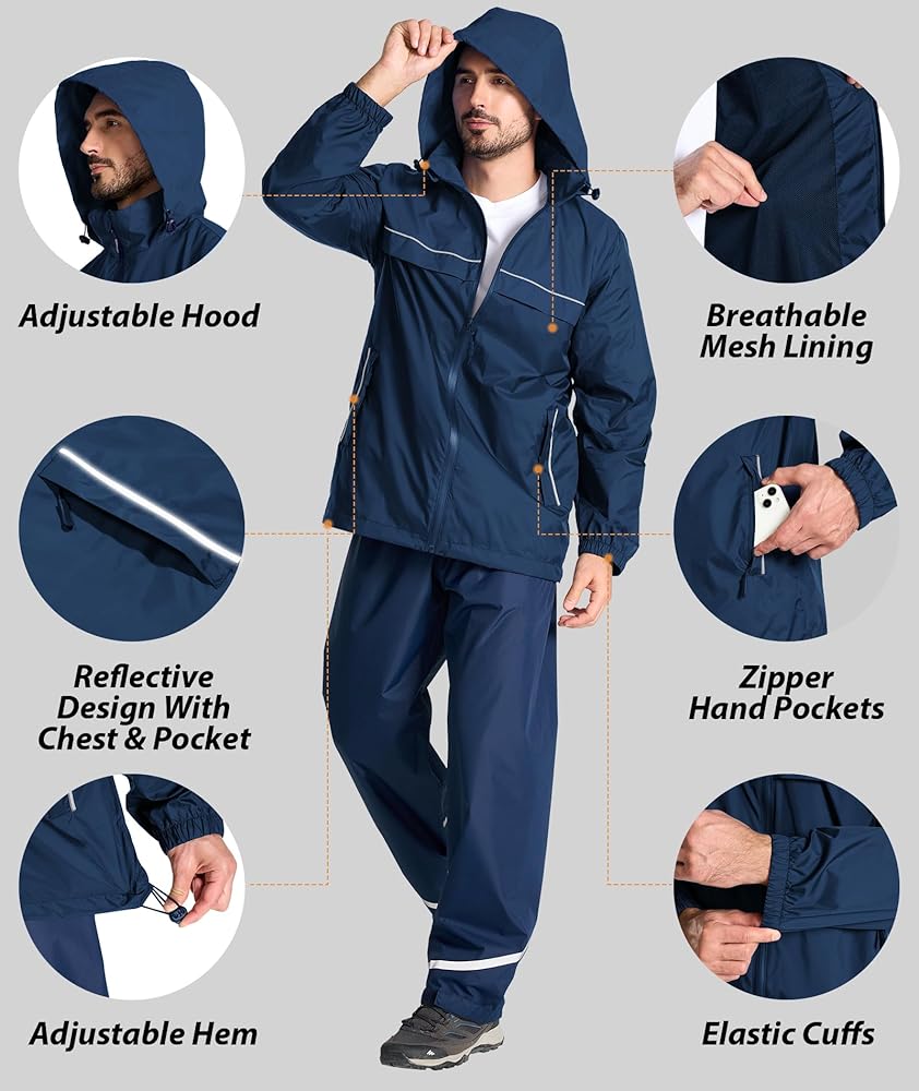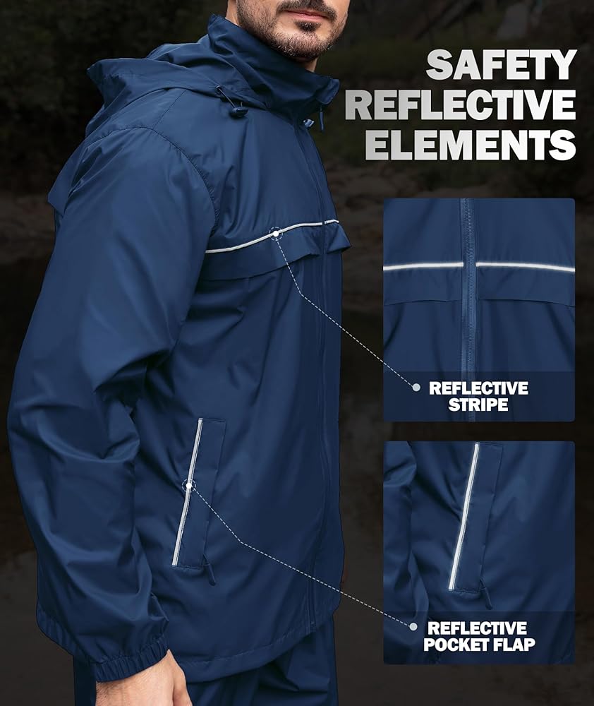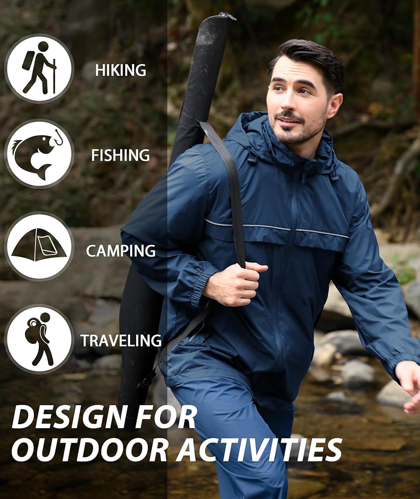 جيدة التهوية وخفيفة الوزن: تتميز سترات المطر الرجالية المقاومة للماء بغطاء رأس قابل للتعديل مع أشرطة فيلكرو، وبطانة شبكية، وسحاب محكم للماء، وأشرطة عاكسة للحفاظ على سلامتك في بيئة منخفضة الإضاءة، وجيبين جانبيين لتخزين هاتفك أو محفظتك، يمكن توضيب هذه السترة خفيفة الوزن في الحقيبة دون عناء. لصالح الراحة، والتخزين المدمج