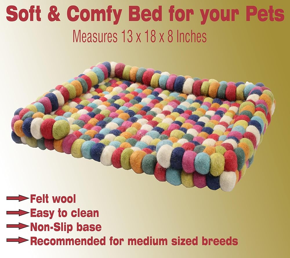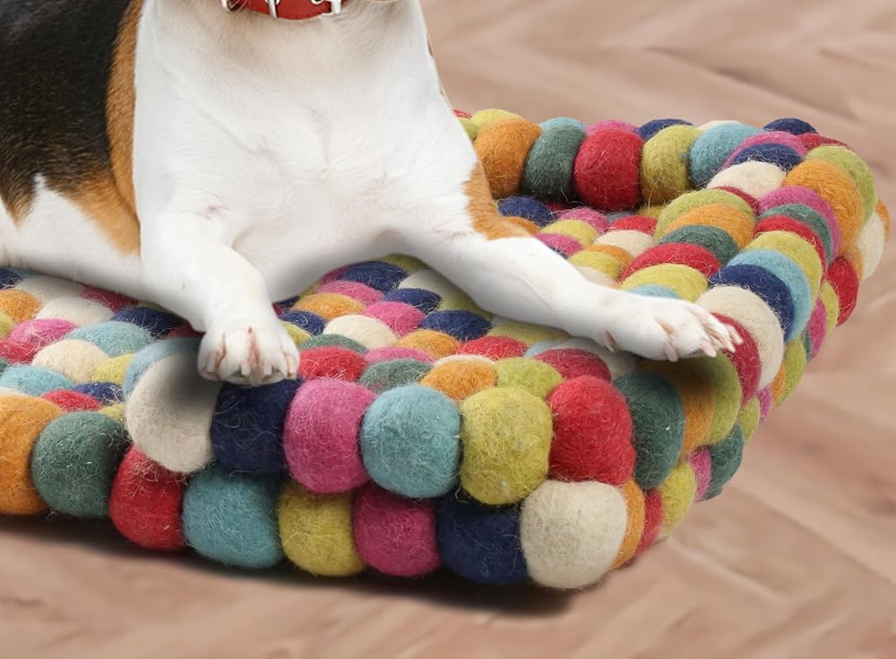 Introducing the Felt Ball Dog Bed - a cozy retreat designed with your furry friend in mind! Handcrafted in rural India, these beds are a testament to sustainable craftsmanship. Made entirely from high-quality wool felt, each bed is meticulously crafted to provide comfort and durability. Measuring at 25 x 18 x 4 inches and weighing approximately 6.5 to 7 lbs, these beds offer ample space for your pet to stretch out and relax. The soft and warm wool felt ensures a snug environment, perfect for those lazy lounging sessions. Not only is the Felt Ball Dog Bed stylish and unique, but it also seamlessly blends into any interior decor. Its timeless design adds a touch of charm to your home while providing your pup with a dedicated space to snuggle up and unwind. But durability is where this bed truly shines. Stain and thermo-resistant, it withstands the wear and tear of daily use, promising years of comfort for your beloved companion. Give your pup the gift of luxury with the Felt Ball Dog Bed - a bed they'll adore and you'll love for its quality and style.