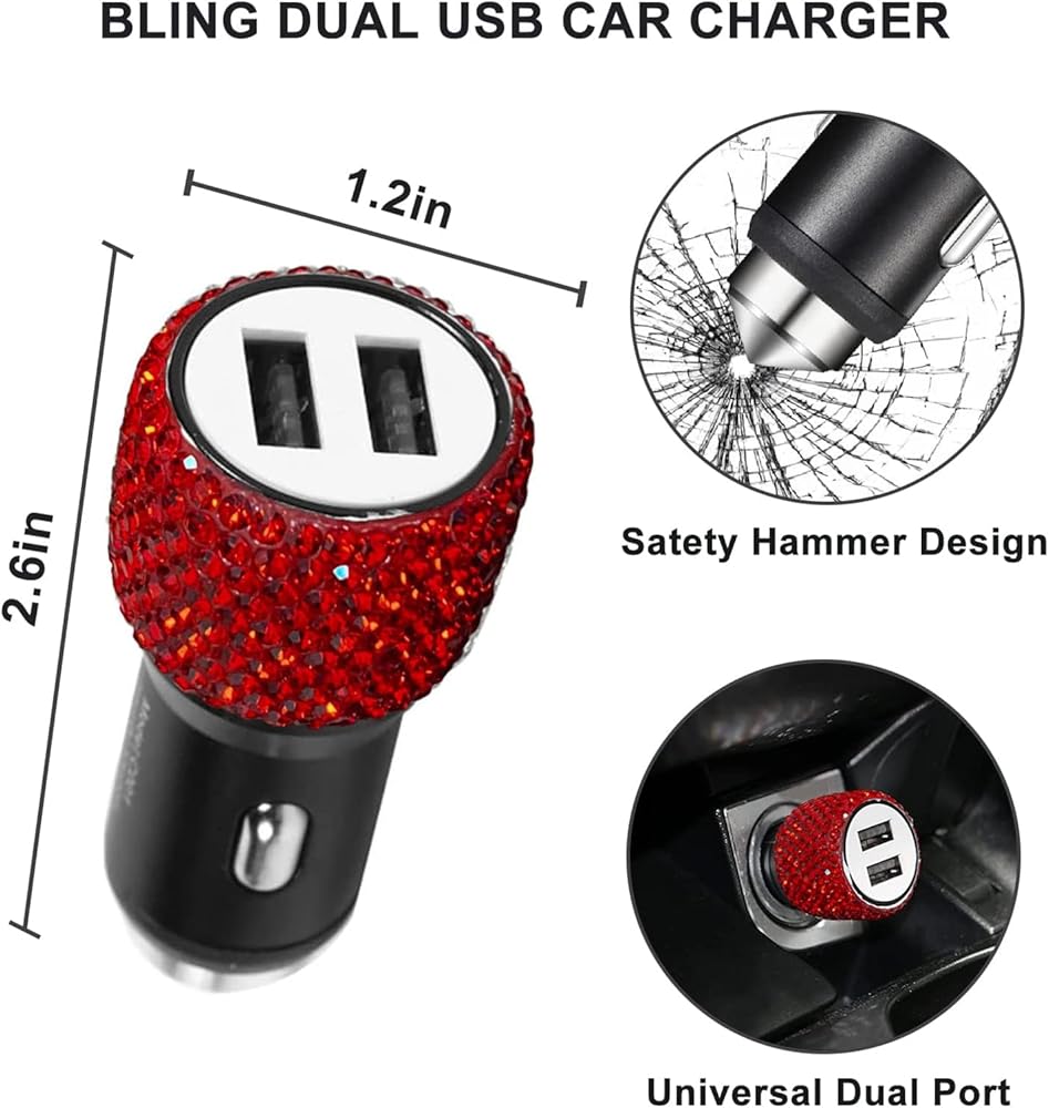 ✨【USB Car Charger Details】Quick Charge Dual Port Charger Adapter, Compatible with iOS and Android. ● Safety hammer design: The special stainless steel tip can be used as an emergency hammer for breaking car windows and emergency escape. ● Hundreds of A++ sparkling crystal rhinestones decorate the girl's car. The perfect gift for women and girls.