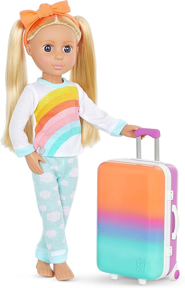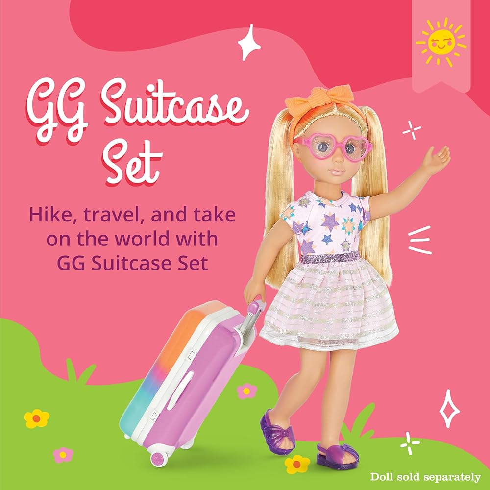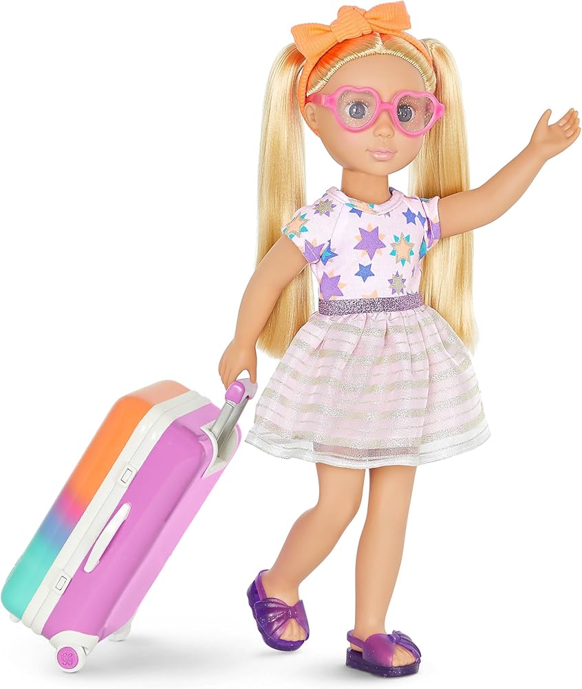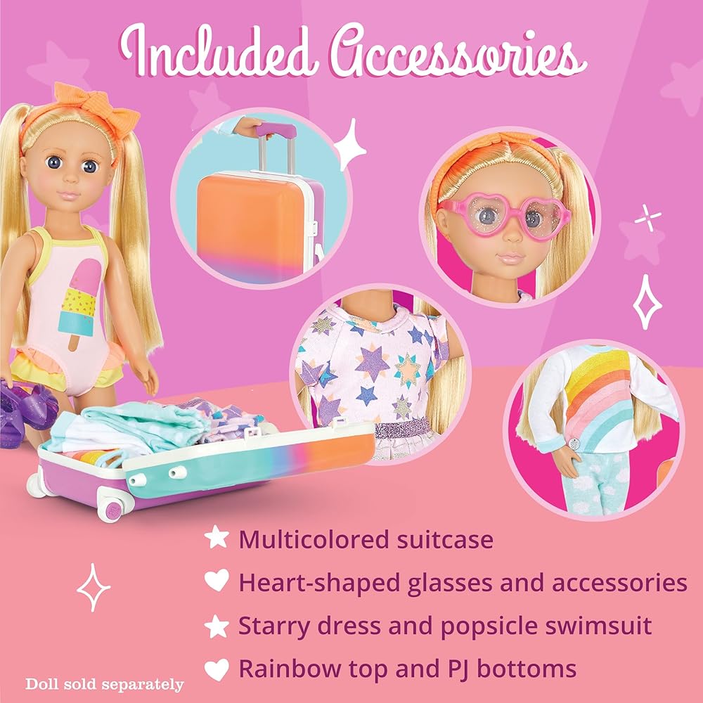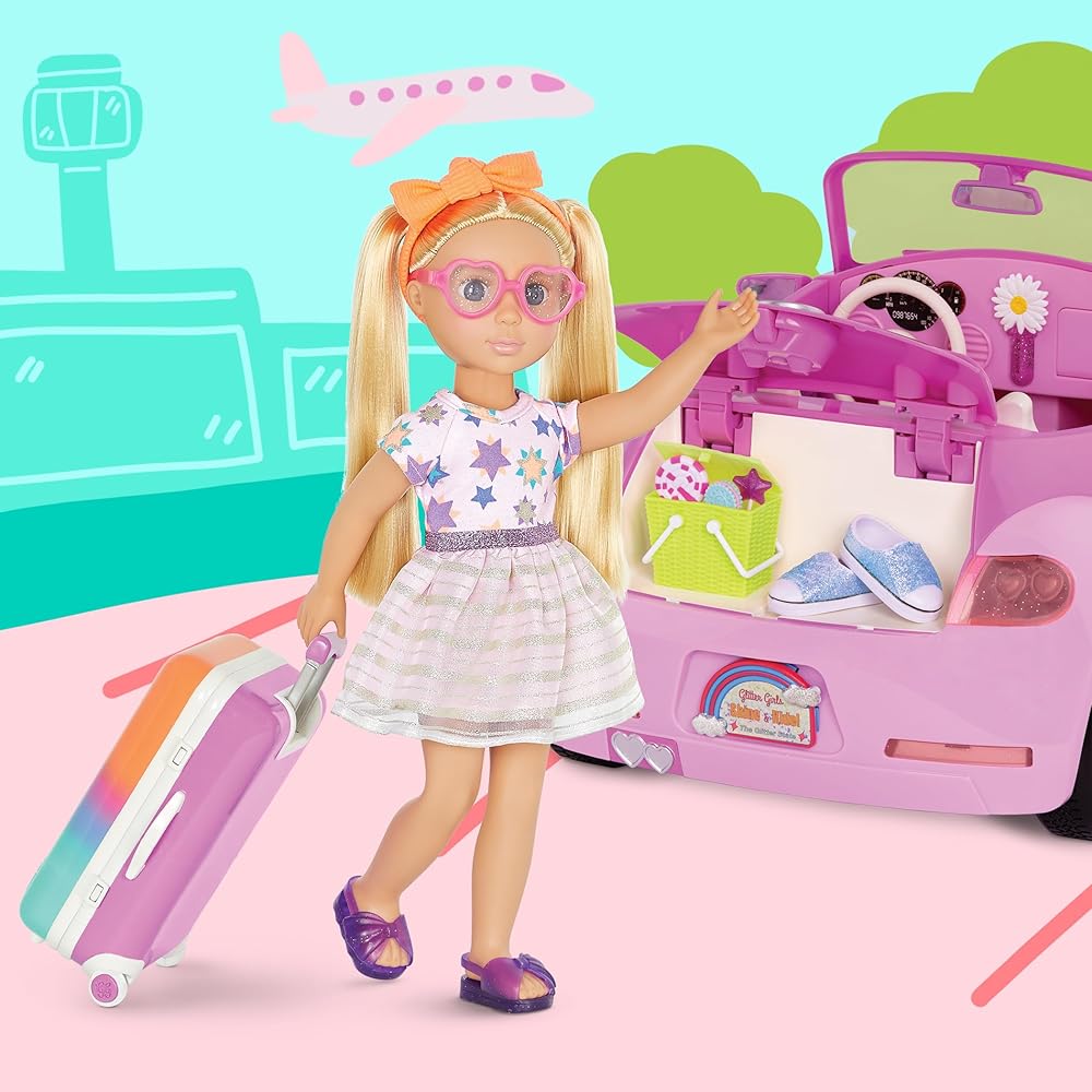 Paint the forest in sparkling colors with Astrid, the 14-inch camping doll from Glitter Girls! Astrid has beautiful hazel eyes, long eyelashes, and long, light red hair that's fun to brush and style. And she's poseable! Her arms and legs bend and rotate to easily change outfits and strike fun poses with friends and pets! Glitter Girls dolls each come with one complete outfit. Astrid is wearing a glittery top with a colorful tent embroidery, a pair of denim-style shorts, rainbow knee-high socks, a super cute camping hat, and clear, glitter boots (for an extra touch of glitz!). Her outfit also has easy-open closures to quickly put on and remove, so Astrid can step outdoors in many colorful fashion looks!