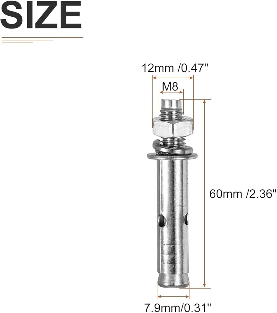مسامير توسيع سداسية - تأتي العبوة مع 30 قطعة من مسامير توسيع الفولاذ المقاوم للصدأ 304 الفضية بحجم الجوز: M8 × 100 مم، قطر الخيط: 8 مم/0.31 بوصة، الطول الإجمالي: 100 مم/3.94 بوصة، حجم الجوز: 12 × 6 مم/0.47 × 0.24 بوصة (عبر الشقق D*T)، قطر الثقب المثقوب مسبقًا: 7.9 مم / 0.31 بوصة، عزم دوران التثبيت: 8 أقدام/رطل، حجم الحشية: 8 × 15 × 1 مم/0.31 × 0.59 × 0.04 بوصة (ID*OD*T) .