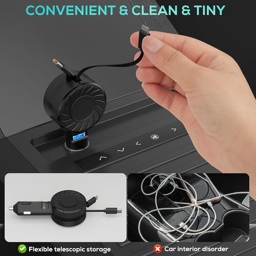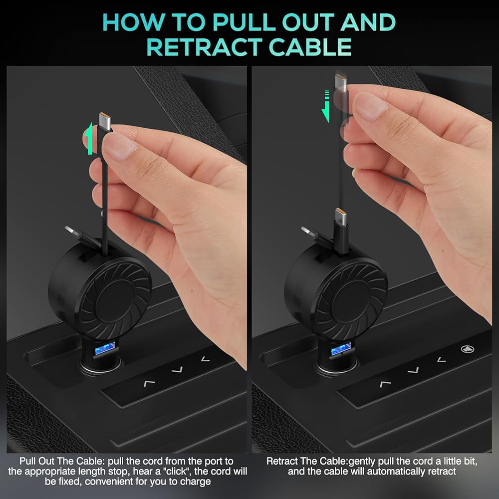 كابلات شحن متعددة قابلة للسحب: قطعتان من الحبال القابلة للسحب (أحدهما كابل إضاءة والآخر كابل USB-C) تدعم المزيد من الراحة للشحن في السيارة. يتيح لك الكابل الطويل شحن الجهاز في أي مقعد وفي نفس الوقت استخدام الهاتف مجانًا. يتم سحب الكابل بسلاسة وتلقائية، مما يوفر مساحة تخزين سهلة. عند الاستخدام، ما عليك سوى سحب الكابل حتى تسمع "نقرة" للتثبيت الآمن، مما يجعل الشحن سهلاً. عند عدم الاستخدام، تقوم شد لطيف بسحب الكابل تلقائيًا، مما يحافظ على المساحة نظيفة ومرتبة.