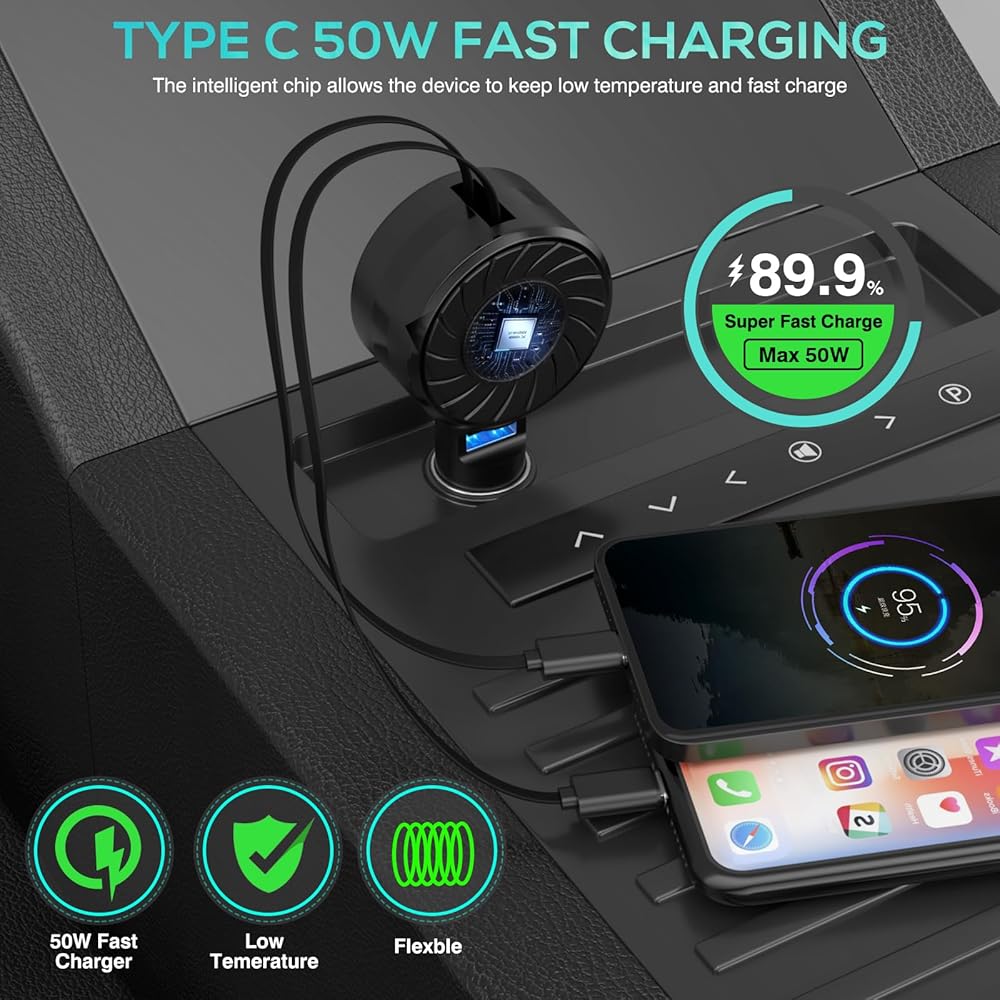شاحن سيارة قابل للسحب، 3 في 1 شاحن هاتف سيارة سريع الشحن 50 وات، محول سيارة صغير مع كابلين + 1 منفذ ولاعة سجائر USB C شاحن لهاتف Apple iPhone 15 Pro/Samsung/Android/Pixle