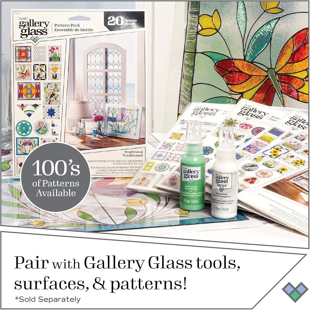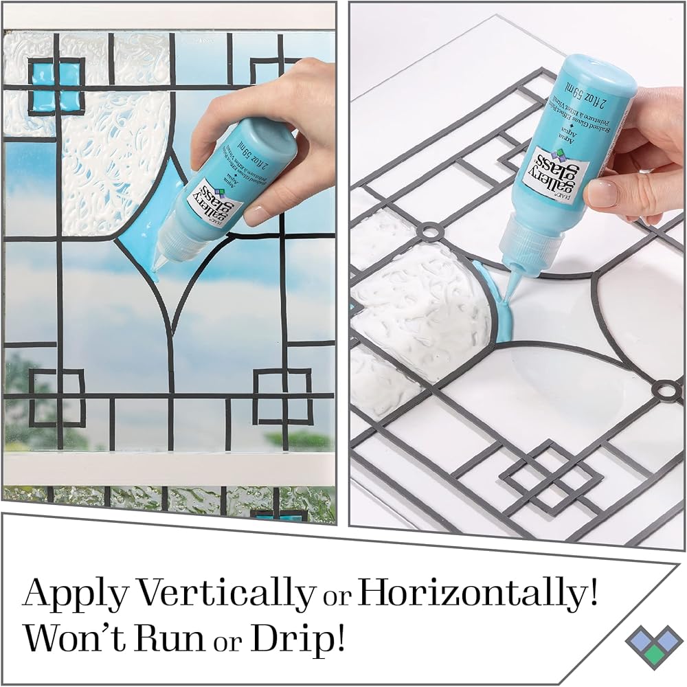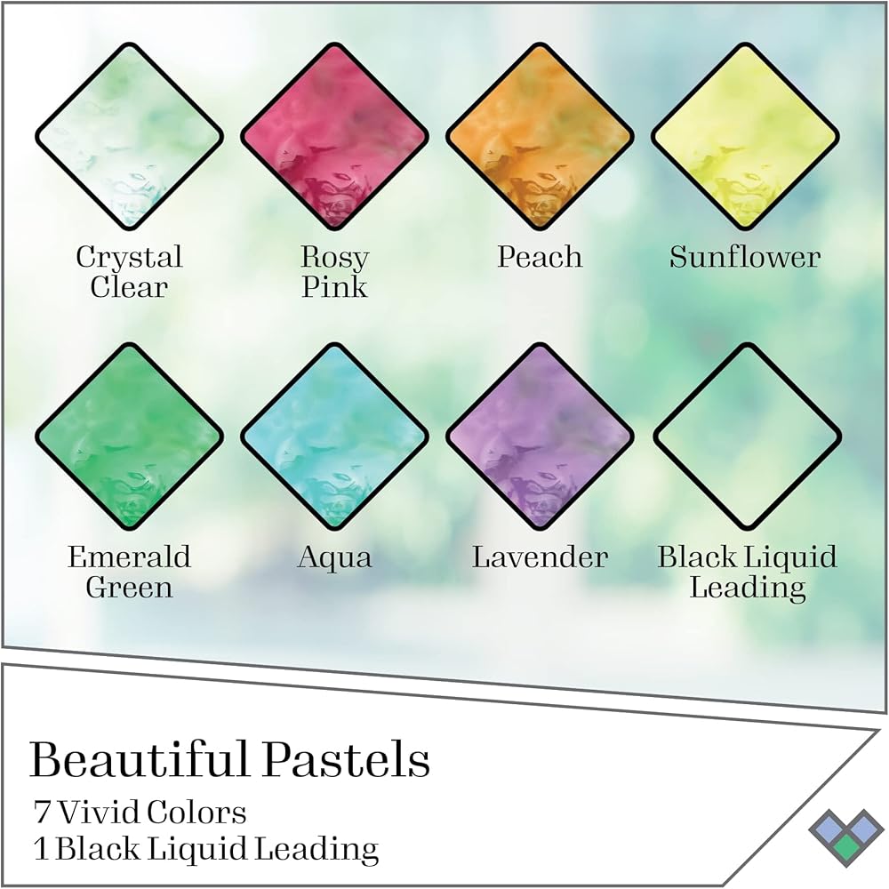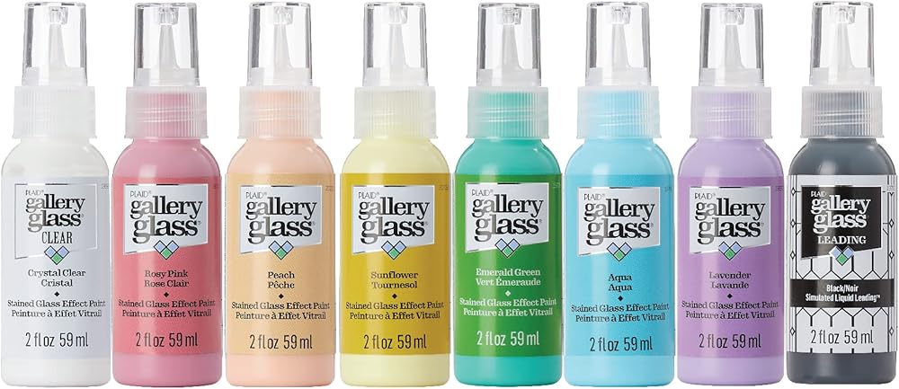 REALISTIC STAINED GLASS EFFECT - This unique stained glass paint set has 8 brilliant, pastel colors - perfect for creating a realistic stained glass effect on all your glass DIY projects! This glass paint comes in a 2 oz size. Do not shake or stir. The colors in the set include Gallery Glass Crystal Clear, Emerald Green, Peach, Rosy Pink, Sunflower, Aqua, Lavender, and 1 bottle of Gallery Glass Black Liquid Leading