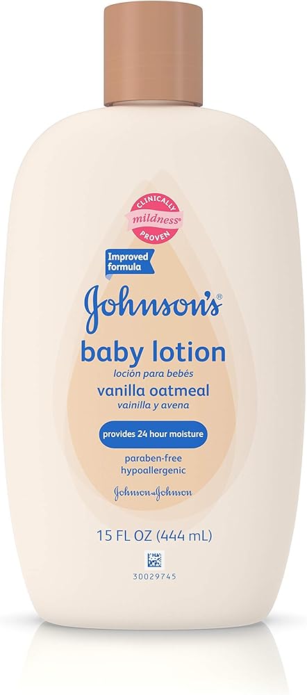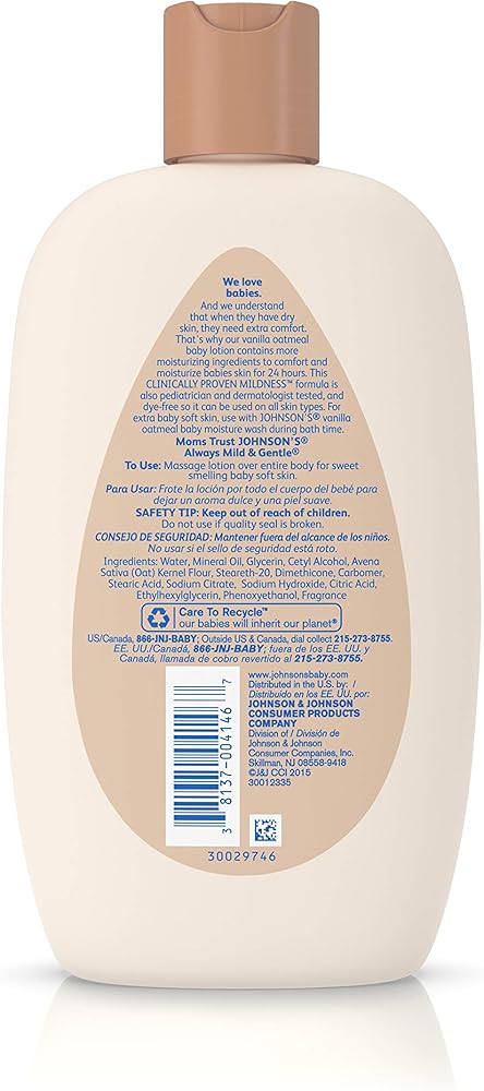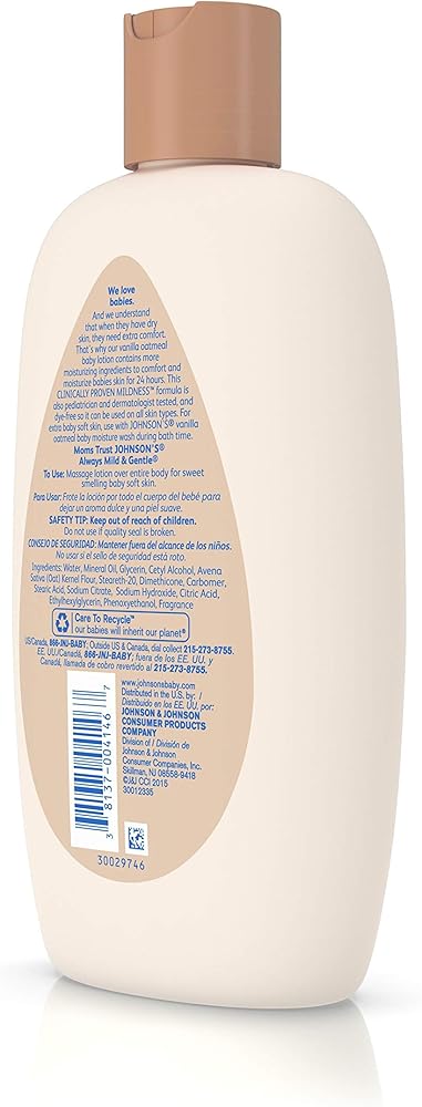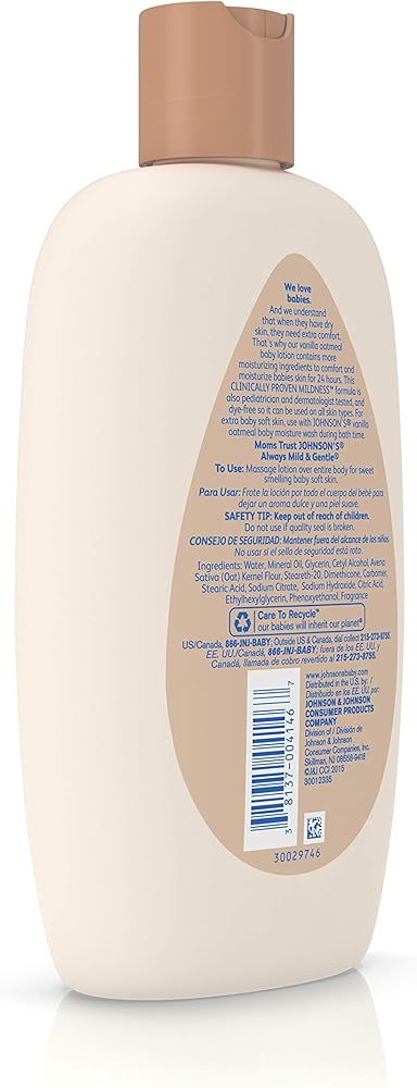 Johnson's Baby Vanilla Oatmeal Lotion helps comfort and moisturize baby's skin. Formulated for babies, this dermatologist-tested moisturizer is clinically proven to be gentle and mild for your baby's skin. It moisturizes for 24 hours and helps maintain your baby's skin's natural moisture. This non-greasy, fast-absorbing baby lotion contains oatmeal, an ingredient long known for its moisturizing properties, as well as gentle emollients and the comforting essence of vanilla. Johnson's Baby Vanilla Oatmeal Lotion is hypoallergenic and gentle enough for daily use.