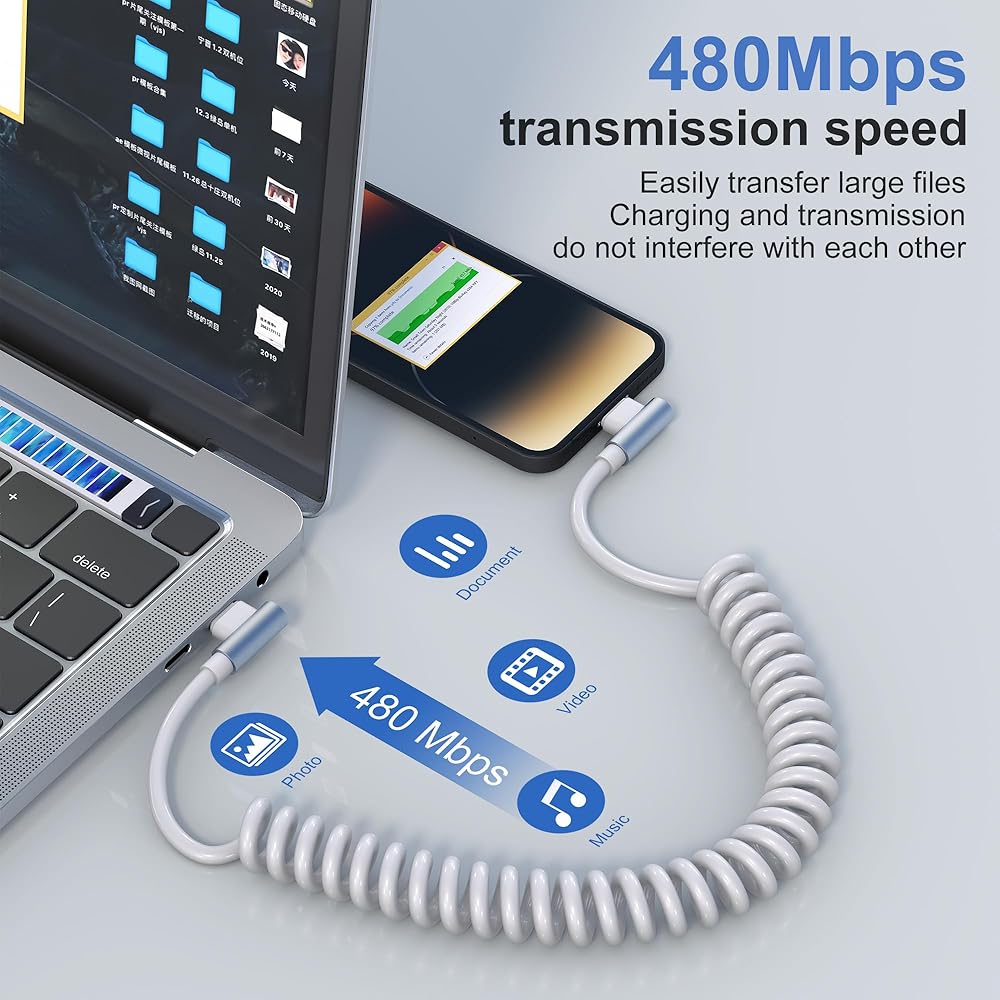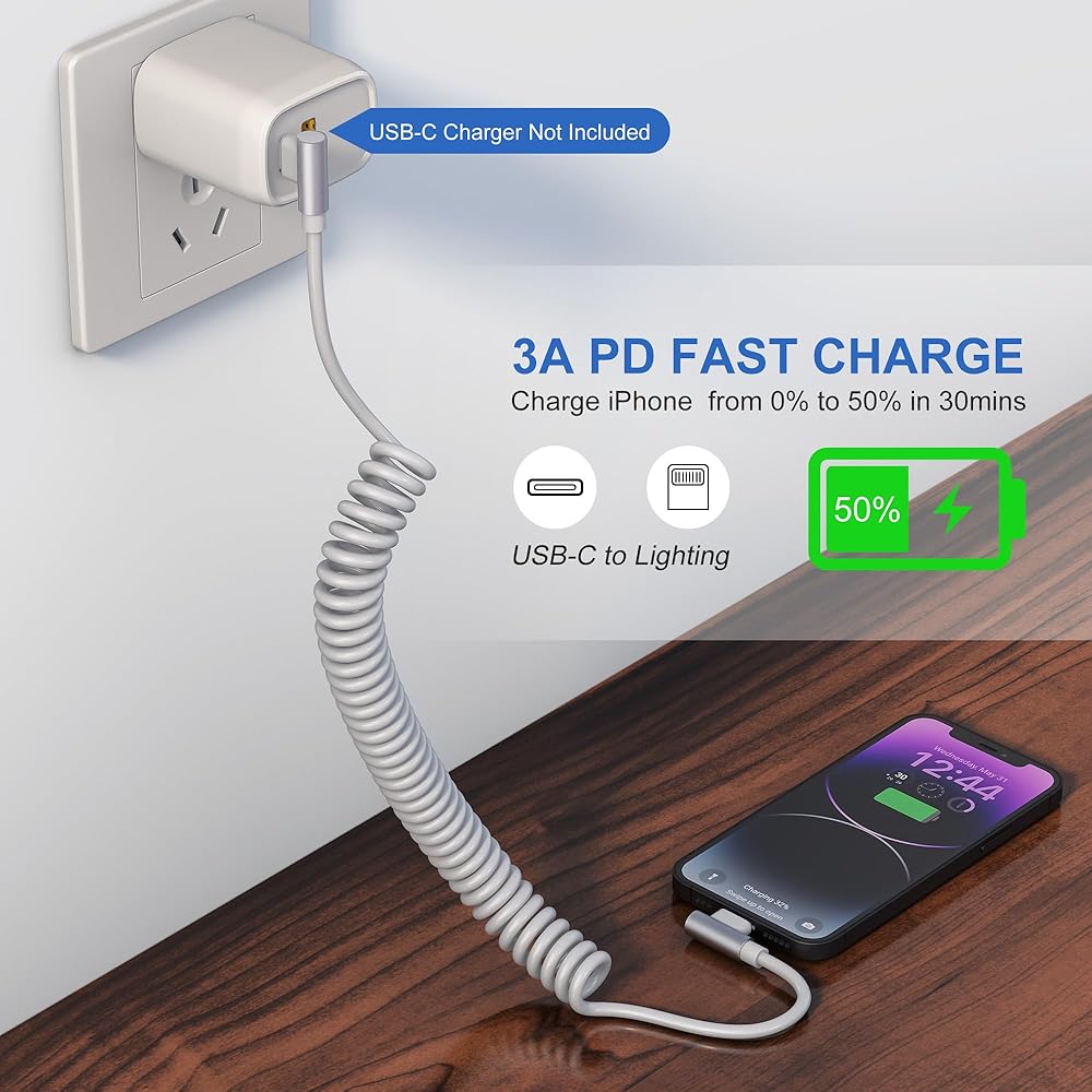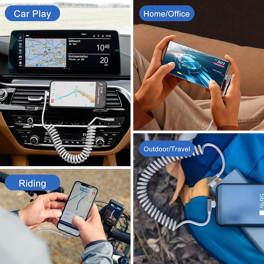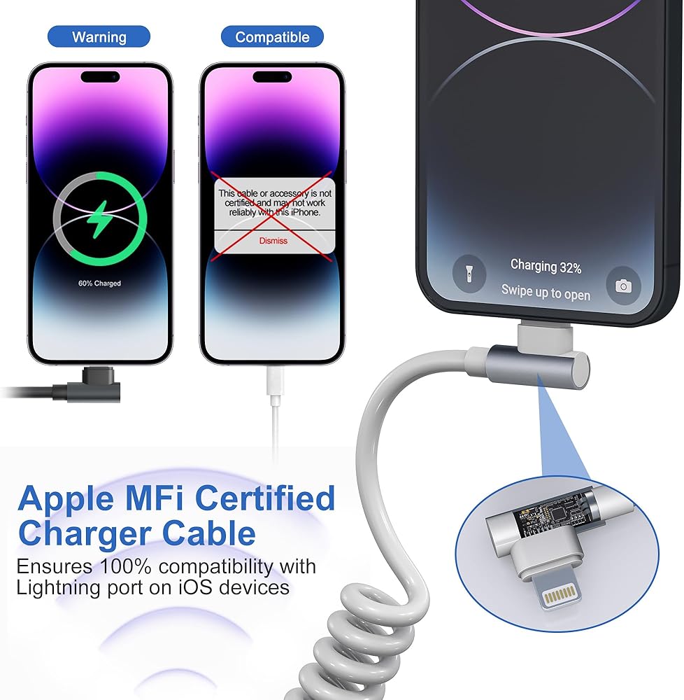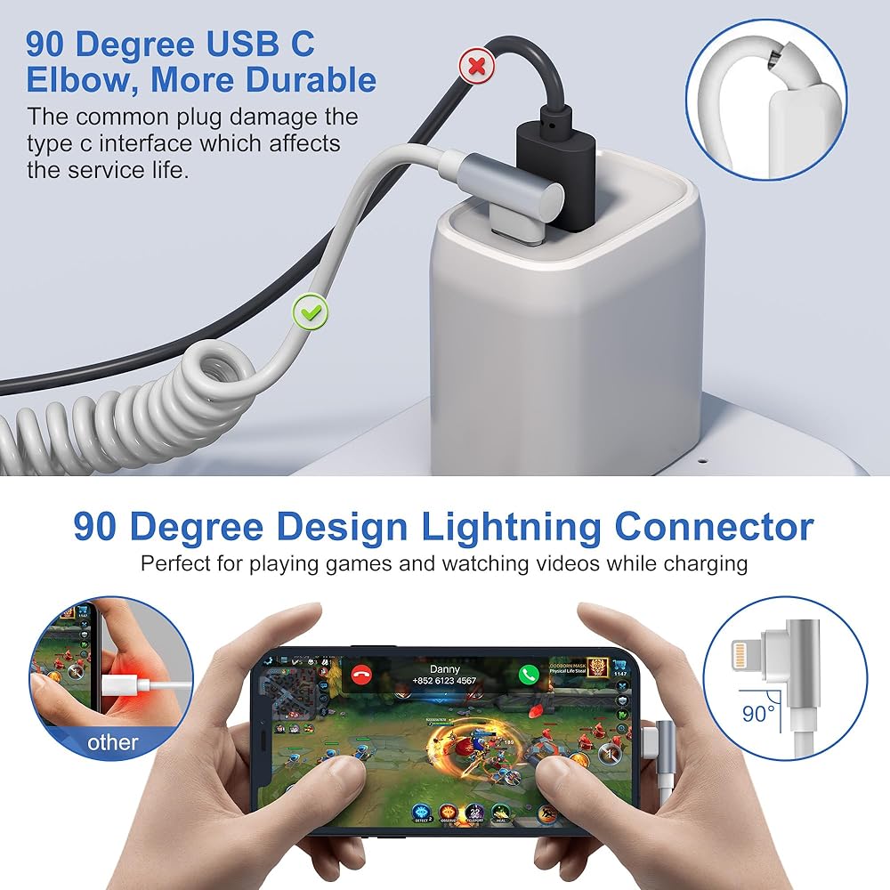 معتمد من Apple MFi وجودة عالية: ملفوف بمنفذ USB C ذو الزاوية اليمنى مصنوع من مادة TPU عالية الجودة وسلك نحاسي. كابل البرق القابل للسحب متين ومرن وغير متشابك ومقاوم للانحناء وليس من السهل كسره. اجعل عمر الشحن الخاص بك أكثر راحة وأمانًا. كابل USB C إلى Lightning للسيارة يستخدم شريحة معتمدة من MFi وموصل C94 مطور، متوافق بنسبة 100% مع iPhone/ iPad/ iPod.