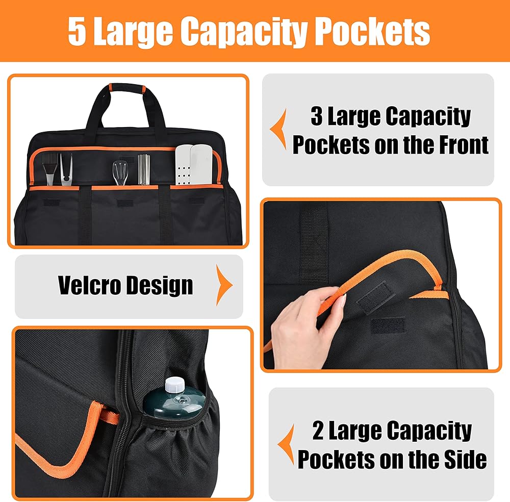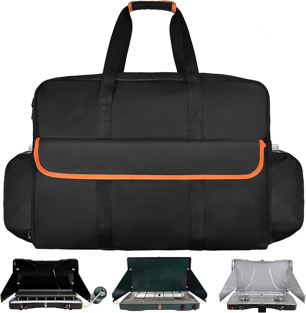 • 【Multiple Pockets】Bring everything you need in one bag! Our camp stove burner carry bag has three large front pockets for your barbecue tools, cookware, seasonings and other accessories and two side pockets for propane cylinders.