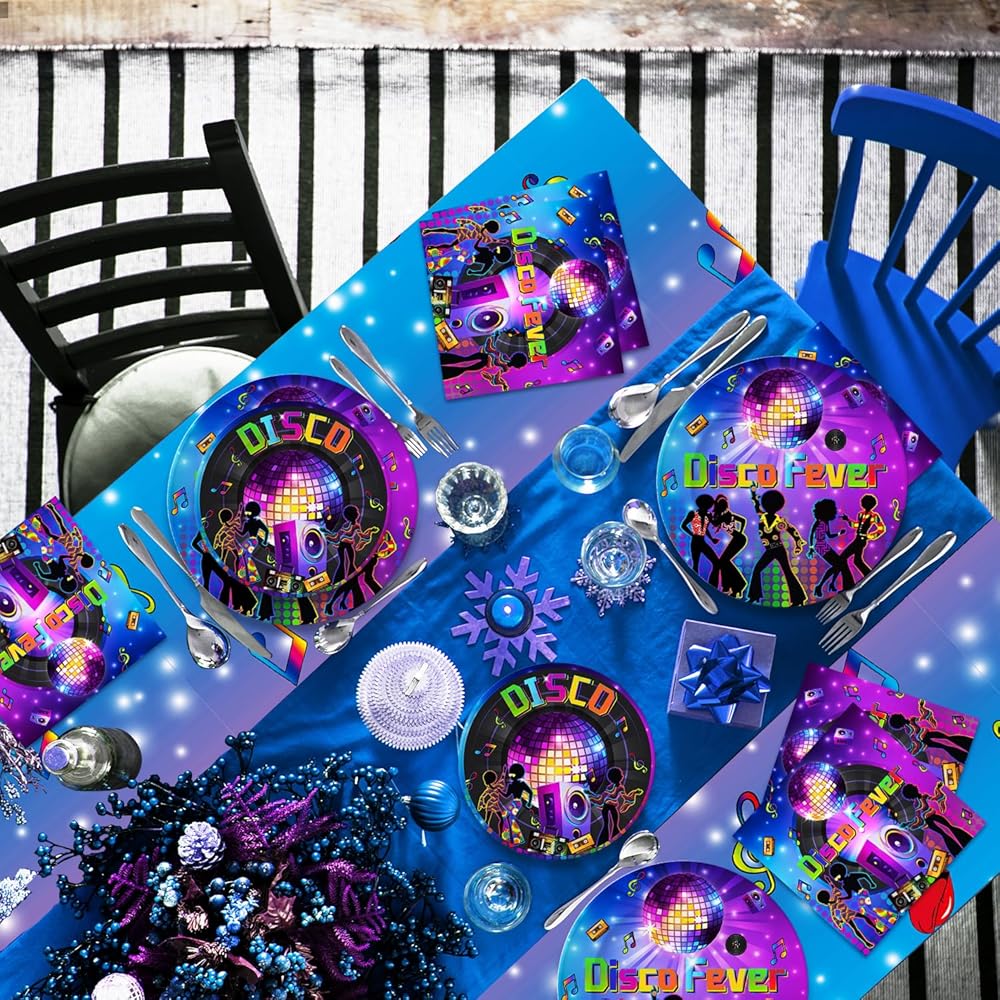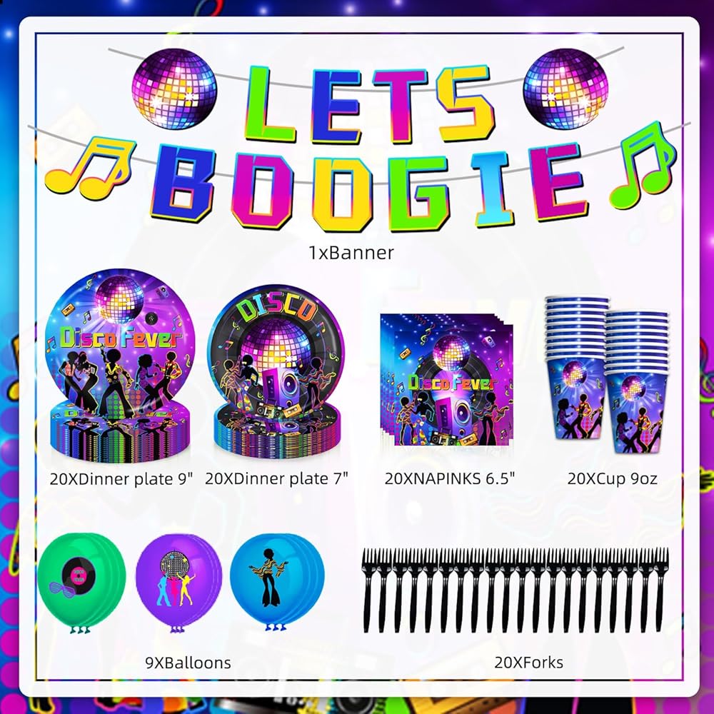 Value Pack: Our disco party decorations set contains 111Pcs to host a party for 20 guests.include 1 ‘happy birthday' banner, 20 large 9" paper plates, 20 small 7" paper plates, 20 paper cups, 20 paper napkins, 20 forks, 9 balloons, 1 tablecloth, 9 balloons. Use our 70s party decorations to throw a fun birthday party.