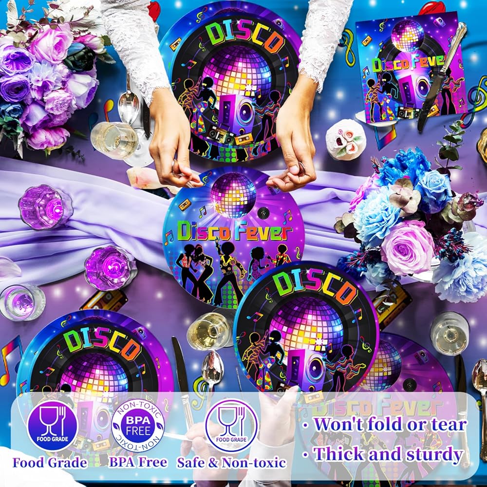 Quality Material: 70s party decorations set is made from safe and reliable materials, napkins, paper plates, cups are made from thick paper material and are suitable for food contact. The tablecloth and Forks is made from high quality plastic material, happy birthday banner are made from glitter card stock that won't disappoint in terms of durability, which is are very safe for guests. pair it with other disco party decorations and it came out fantastic!