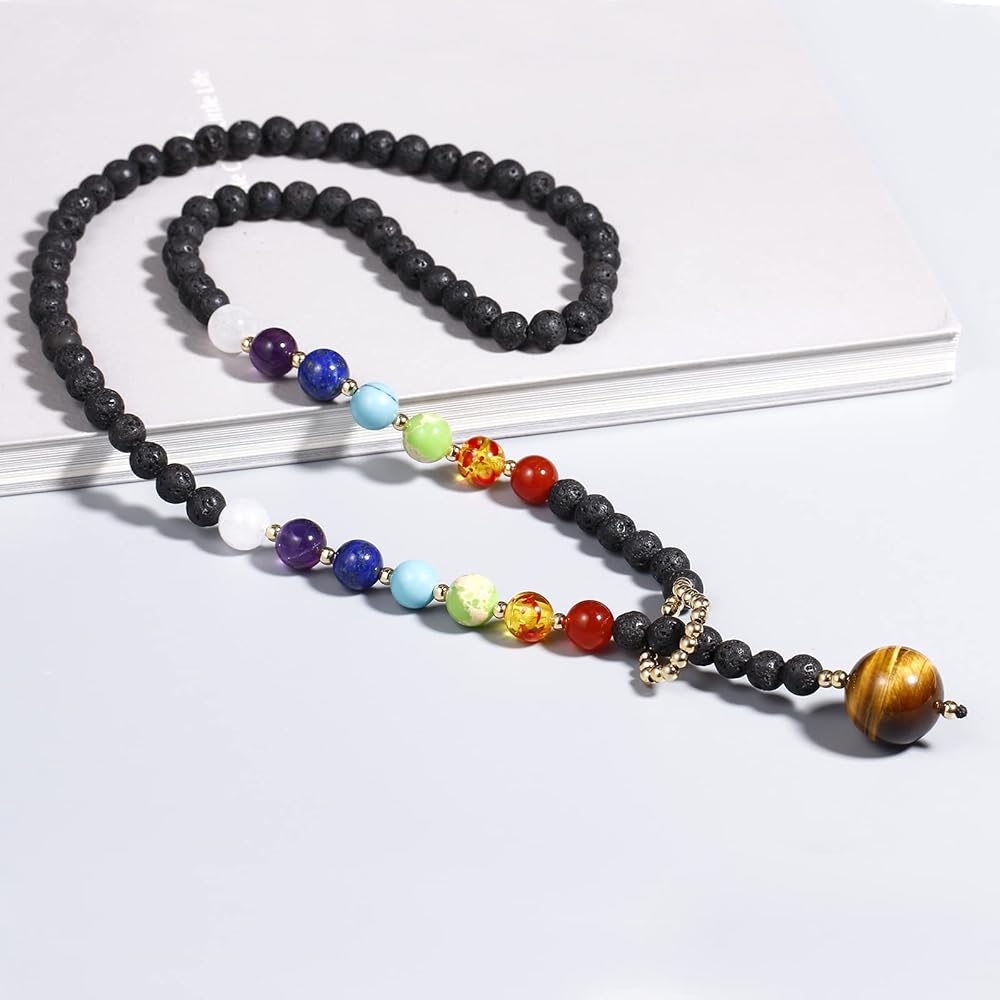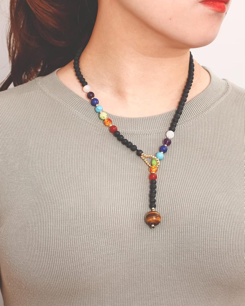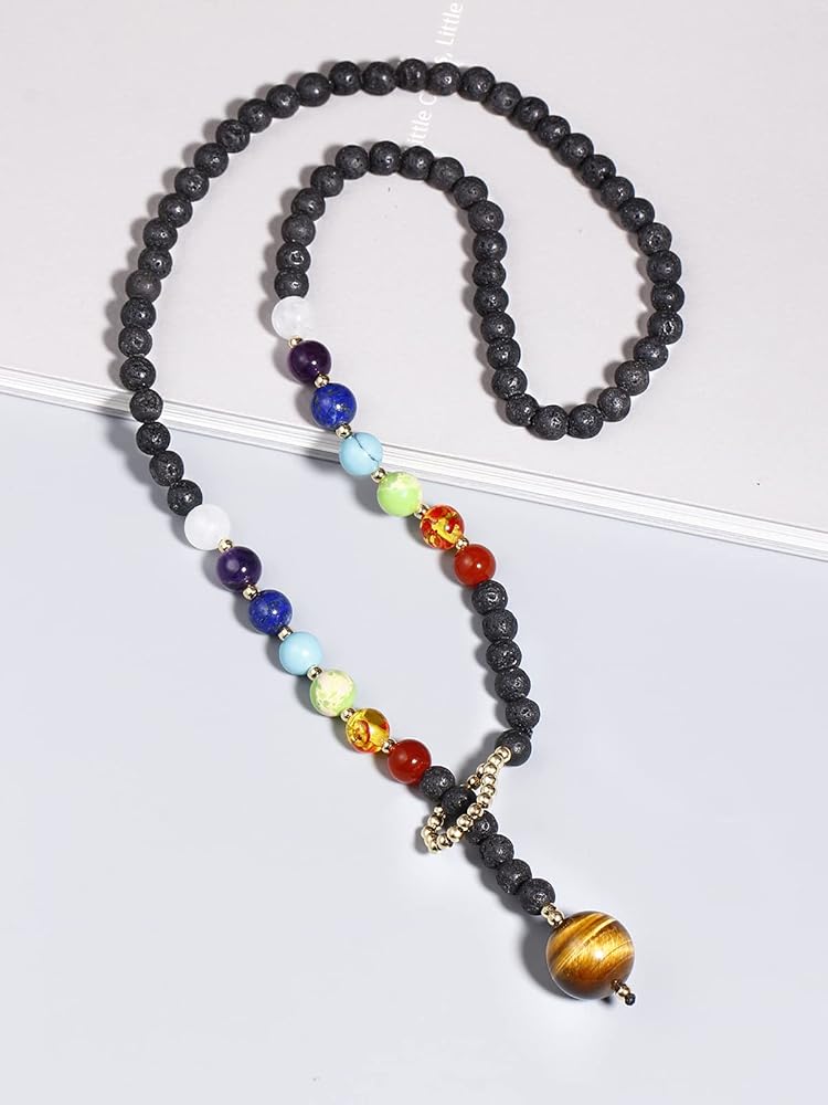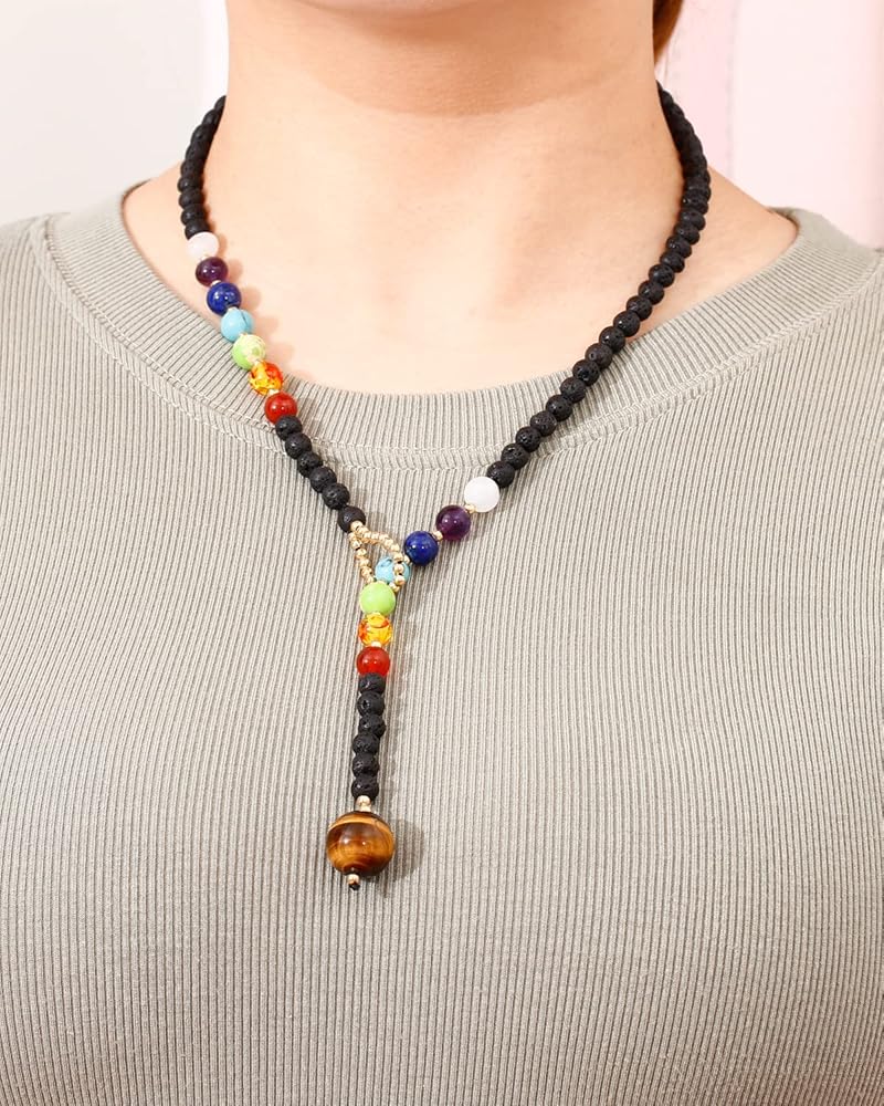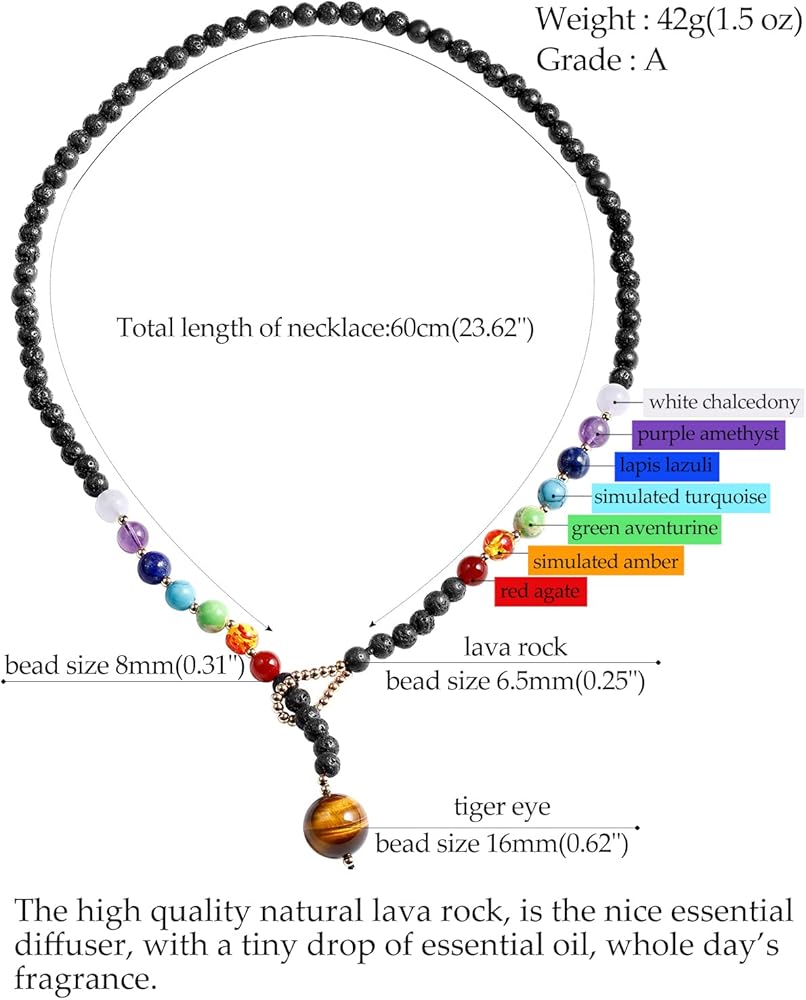 أنا تصميم فريد من نوعه على شكل "y" للنساء مع 7 أحجار شاكرا حقيقية للشفاء، القلادة عين النمر، القطر: 16 مم (0.62 بوصة)، قطر سلسلة حجر اللافا: 6 مم + (0.25 بوصة)، 7 خرزات شاكرا القطر: 8 مم ( 0.31 بوصة)، تشمل: العقيق الأبيض، الجمشت، اللازورد، الفيروز المقلد، أفينتورين الأخضر، العنبر المقلد، العقيق، طول القلادة: 60 سم (23 بوصة)، الوزن: 42 جم (1.5 أونصة)؛