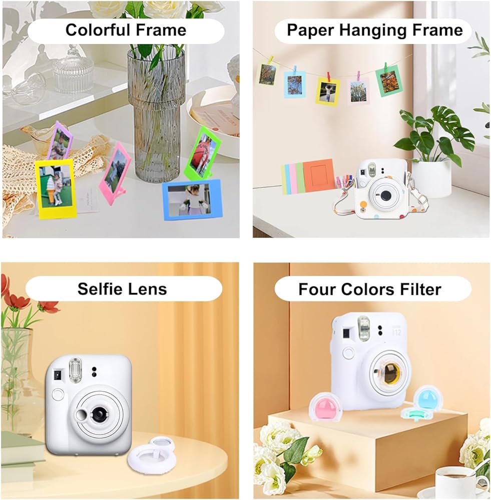 • 【What You Get】:The mini 12 instant camera bundles include camera case x1; 64 pockets photo album x1; color filter x4; selfie lens x1;film border stickers x40; wall hanging frames x 10; colorful mini picture frame x5;tabletop frame x2(two colors); corner sticker x2.Perfect accessories for instax mini 12.(NOTE:Camera is not included)