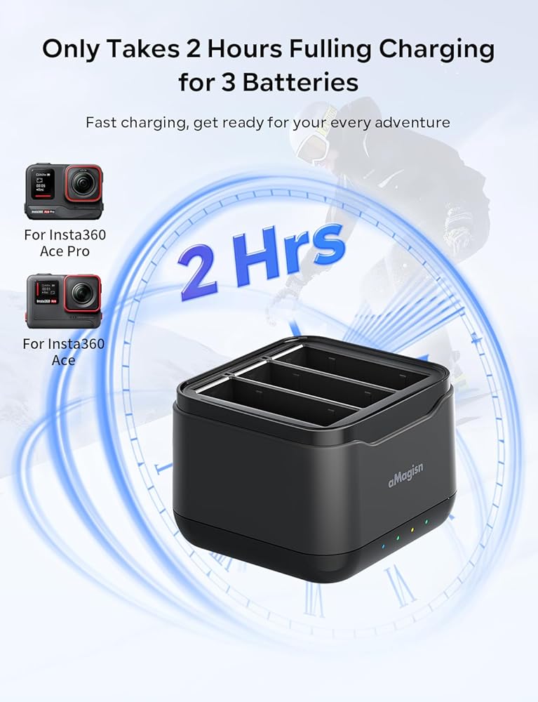 ✅Battery Charging Case for Insta360 Ace/Ace Pro: The 360 Ace/Ace Pro fast battery charger hub can quickly fully charge 3 batteries simultaneously at maximum power in just 2.5 hours, ensuring that your Insta360 Ace/Ace Pro action camera is always powerful. Package Included: 1* aMaiMingji 360 Ace Pro/Ace Charger Hub 1* Tape-C Charging Cable.❌(Note: Insta360 Ace Pro batteries are not included)