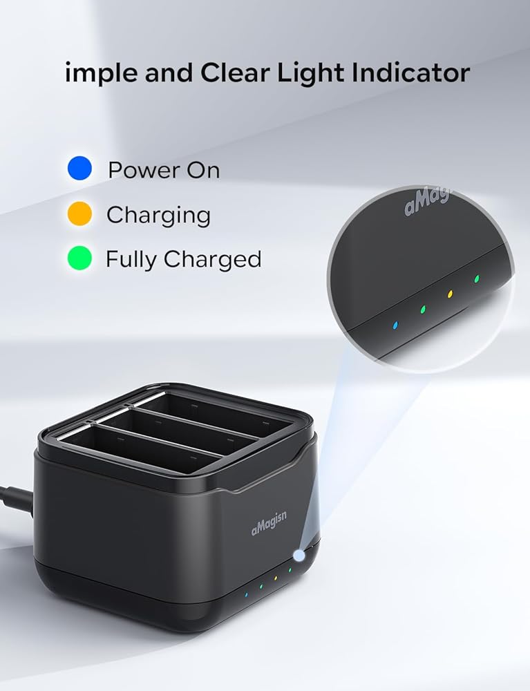 🔋Simple and Clear Charging Indicator: The built-in LED indicator of the 360 Ace Pro battery charger hub can visually display the charging status of each battery. Blue Light: The charger case is connected to the power supply. Yellow Light: The battery is charging. Green Light: The battery is fully charged. Charger Paramater:Input: 5V/2A Output: 4.35V/700mA Charging Duration: 2.5 hours