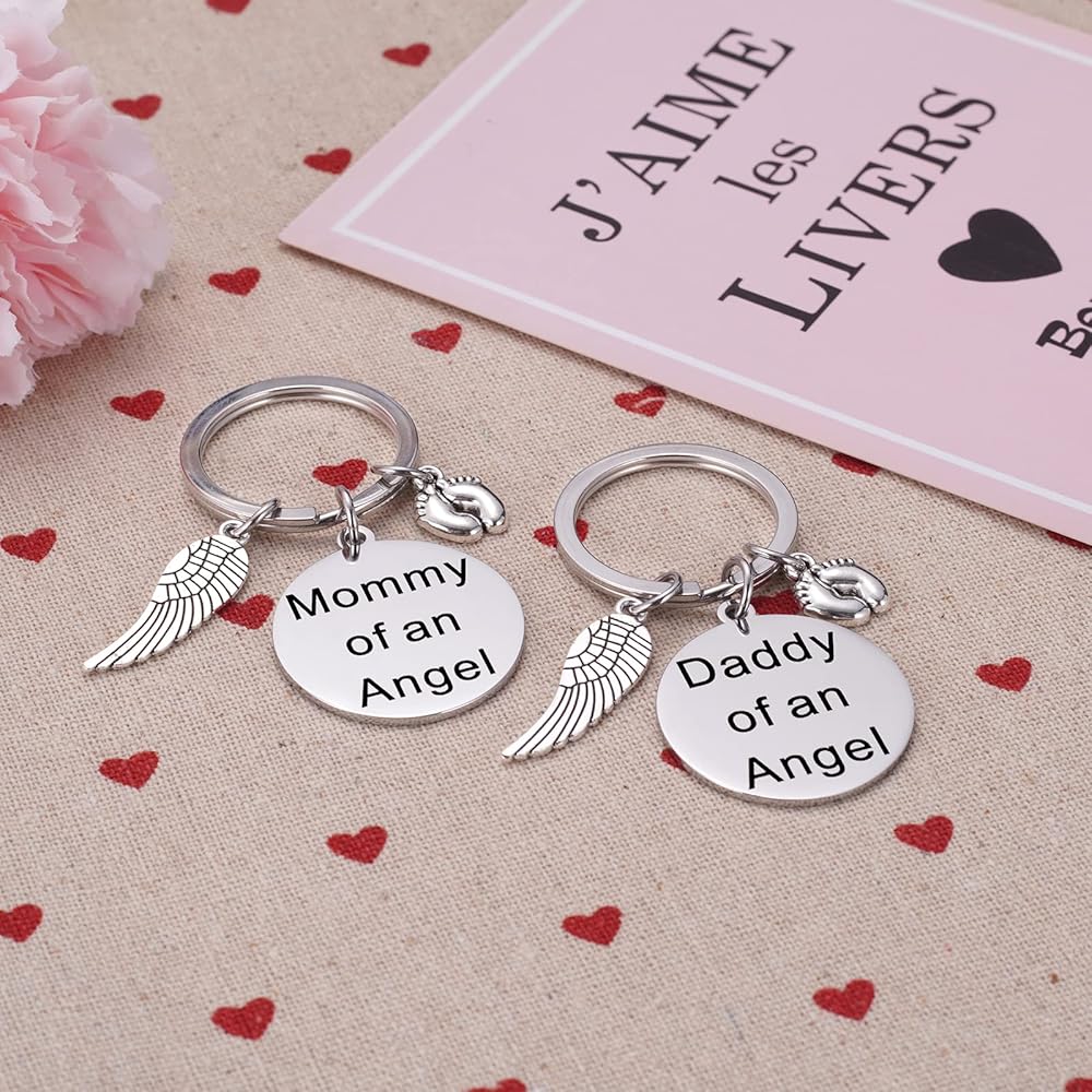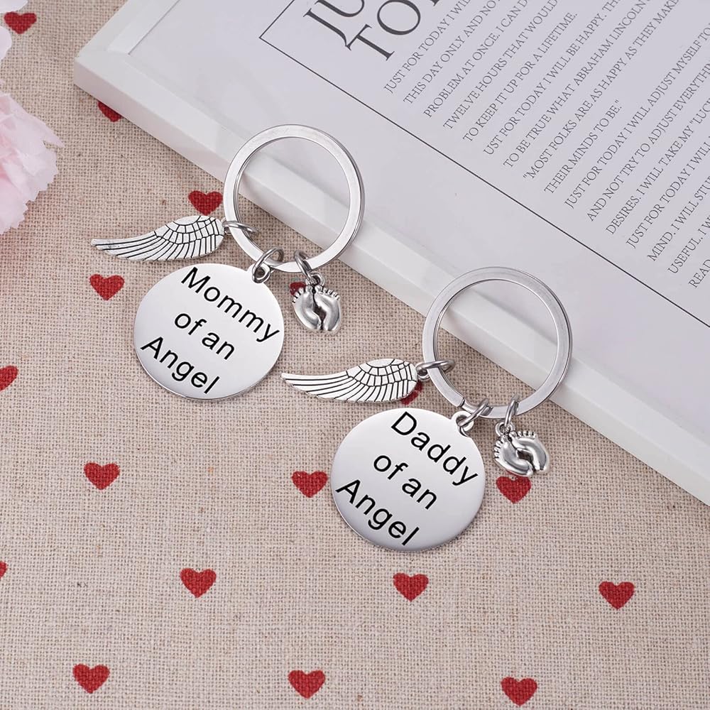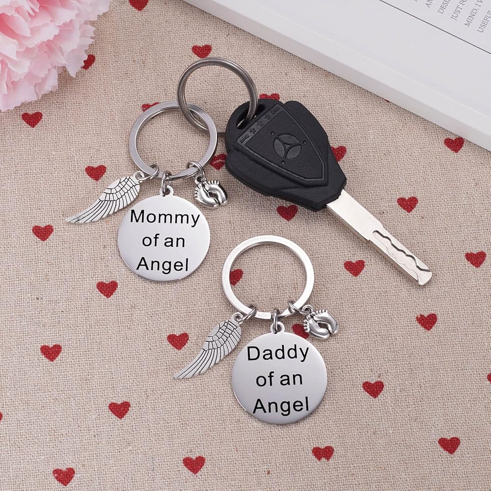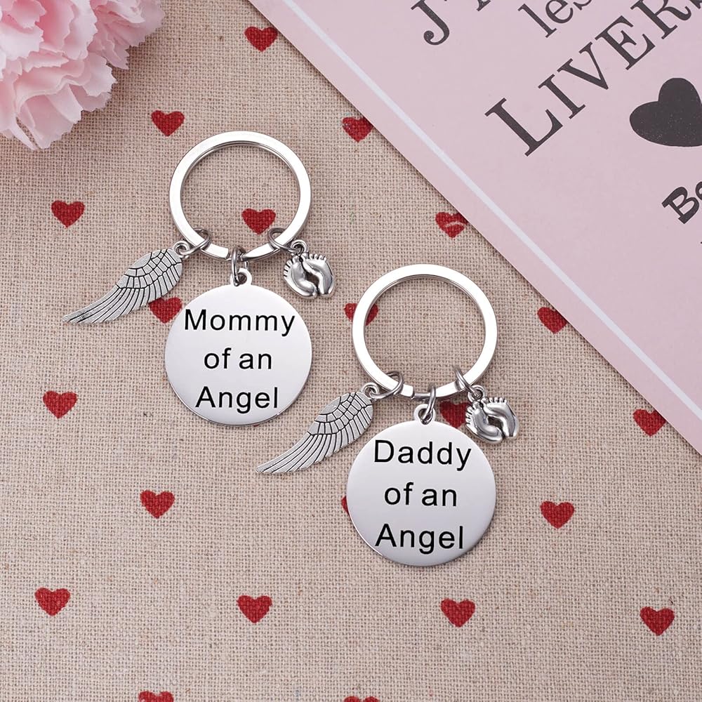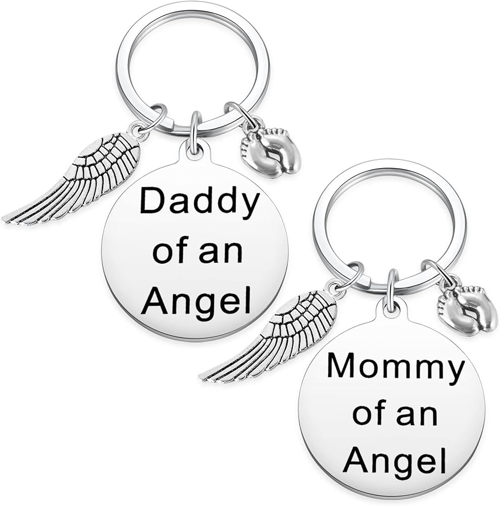 • Memorial Keychain - The keychain are engraved with the phrase "Mommy of an Angel" and "Daddy of an Angel" with babby feet engraved. Along with it is shiny baby feet charm and a detailed silver tone angel wing charm. Makes the perfect memorial gift for Mom and Dad