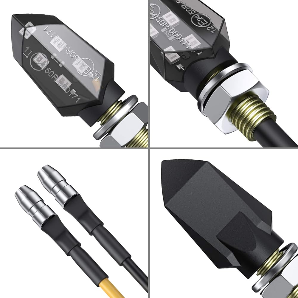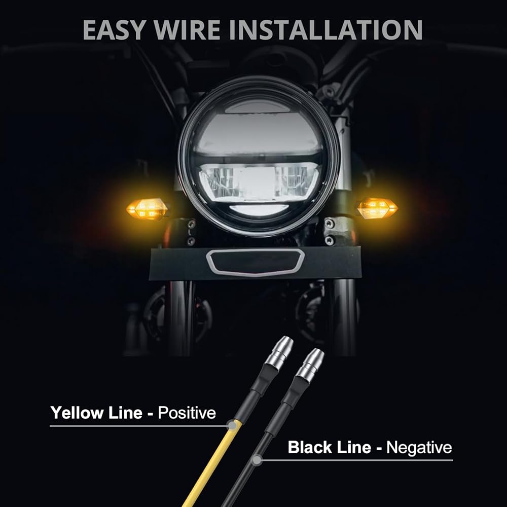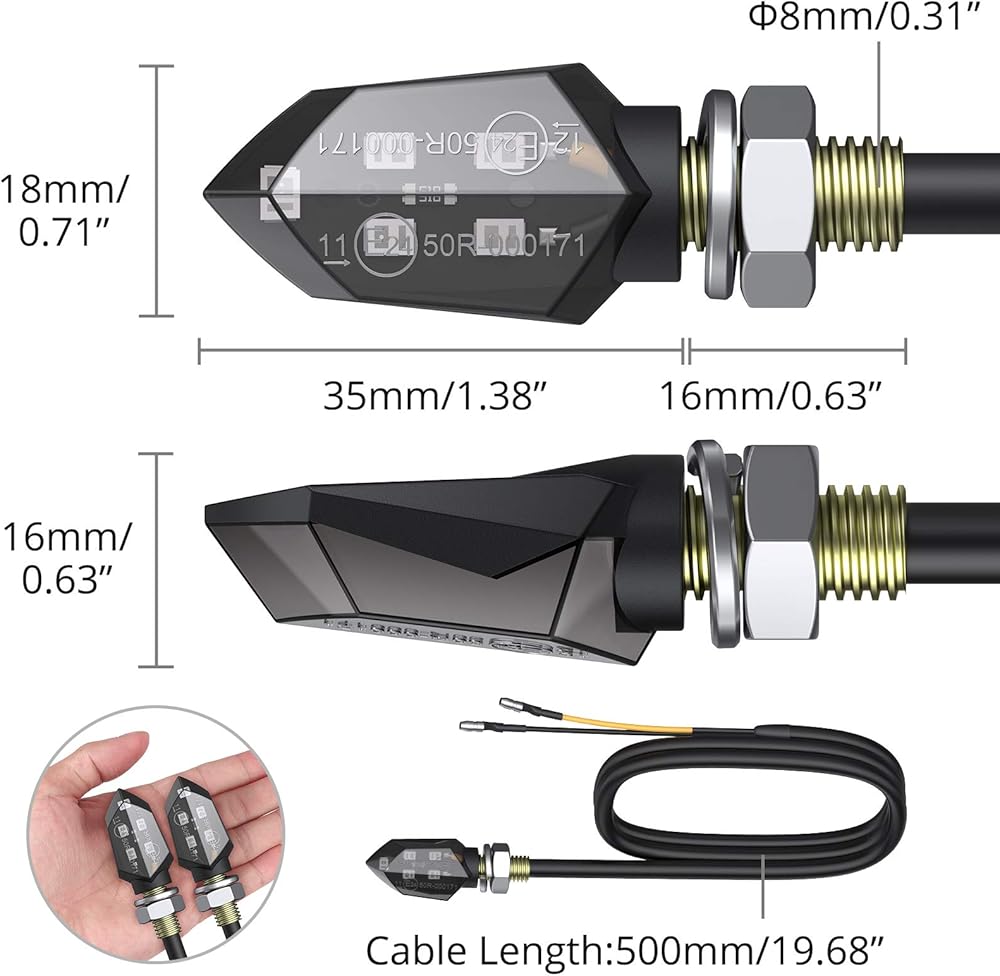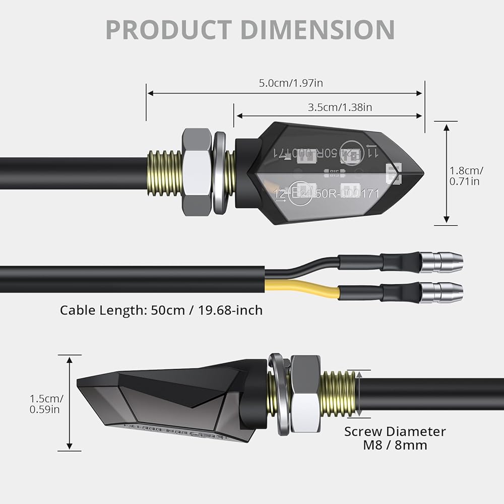 【Compact and Easy to Install】The compact and exquisite mini size of these lights (5x1.8x1.6cm or 2x0.7x0.6 inches) makes installation a breeze. With a 50cm (19.7-inch) cable length, you have flexibility in positioning the lights on your motorcycle. The direct bolt-on design and 2-wire connection make installation quick and hassle-free