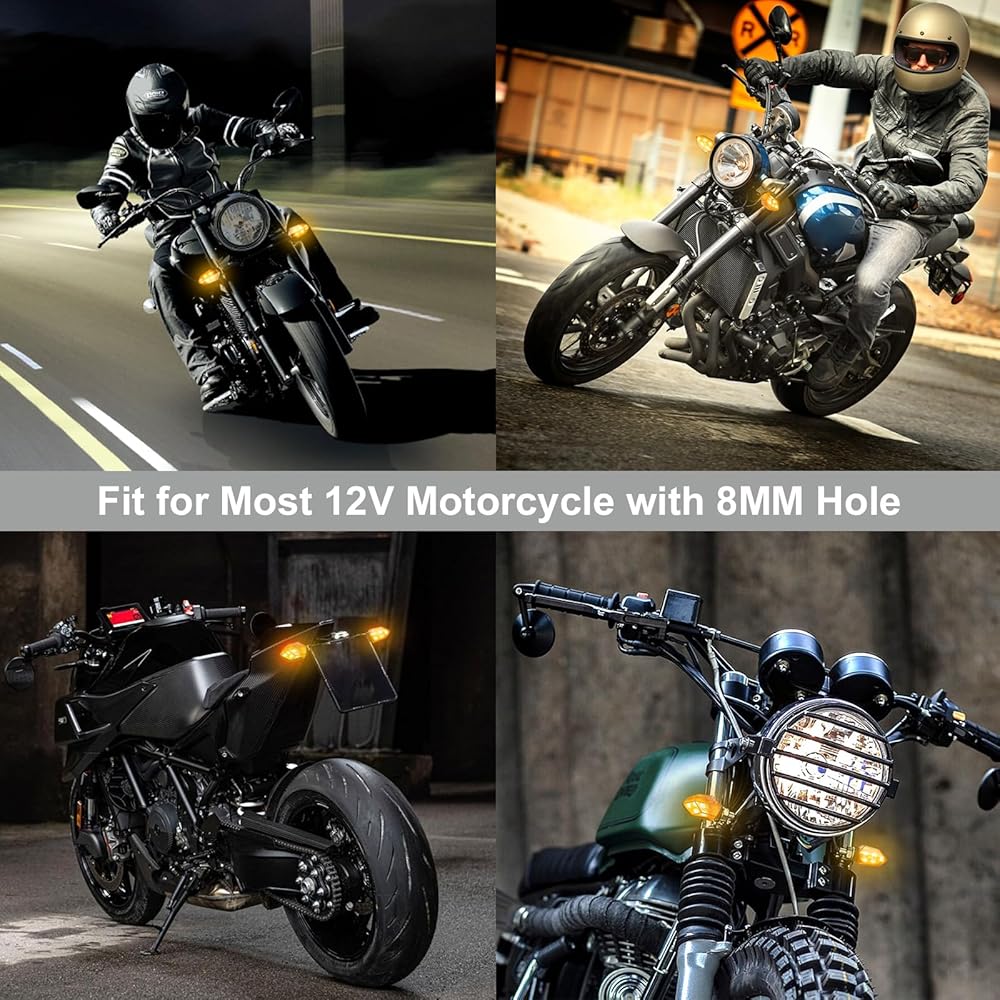 【Wide Compatibility】These turn signal lights are compatible with motorcycles, motorbikes, scooters, quads, cruisers, Harley, Kawasaki, Yamaha, Suzuki, and off-road vehicles. Before making a purchase, please check the size (M8 bolts) and voltage (DC12V) compatibility to ensure a proper fit