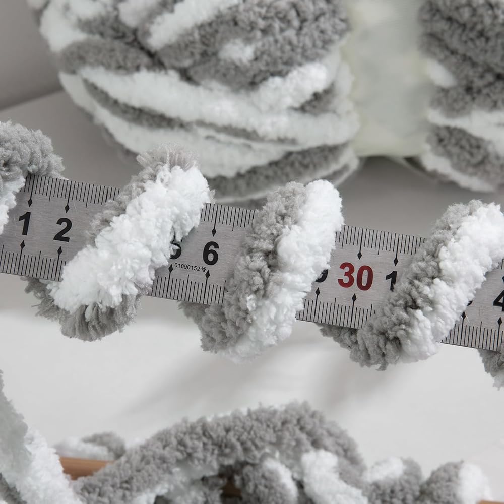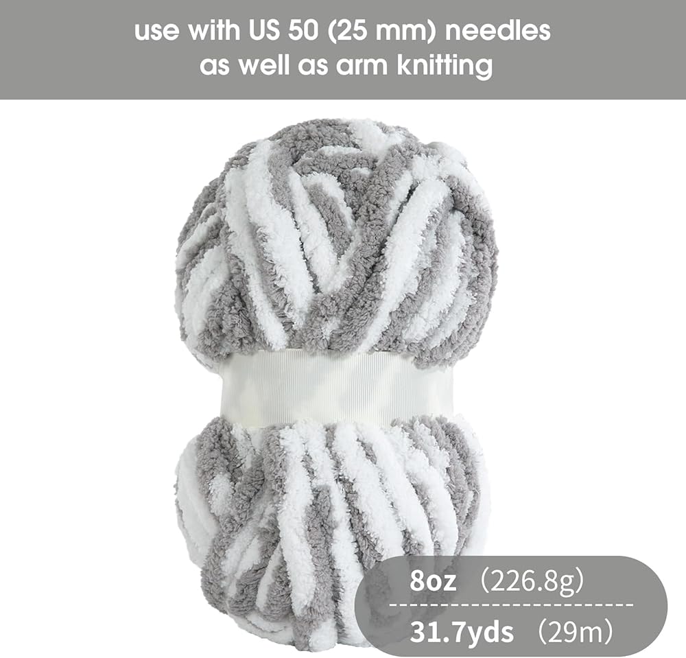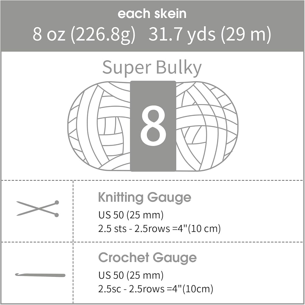 【Jumbo Yarn for Crocheting】 Each skein weighs 8 oz/ 226.8 g and the length is 31.7 yds / 29 m. The diameter of this Chenille Chunky Yarn is approximately 3/4". Knitting Gauge: US 50 (25mm), 2.5 sts - 2.5 rows = 4” (10cm) Crochet Gauge: US 50 (25mm), 2.5 sc - 2.5 rows = 4” (10cm)