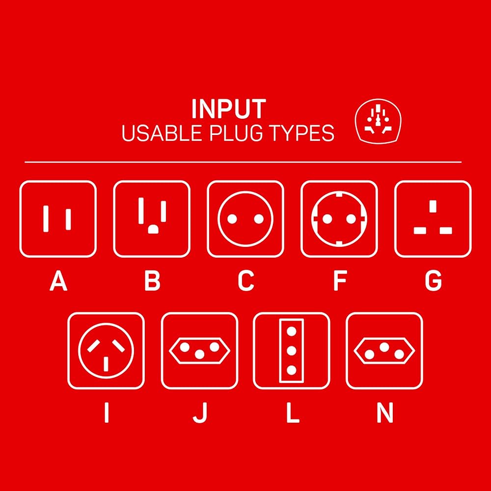 تصميم ذكي: مثالي للأجهزة الكهربائية الصغيرة، ما عليك سوى الضغط على الزر الموجود أعلى محول السفر العالمي، ثم قم بتمرير الدبابيس ذات الصلة، وستكون جاهزًا للانطلاق. المدخلات - الأنواع A وB وC وF وG وI وJ وL وN؛ الإخراج - الأنواع B وE وF وG وI.