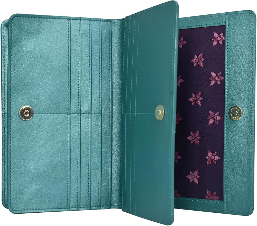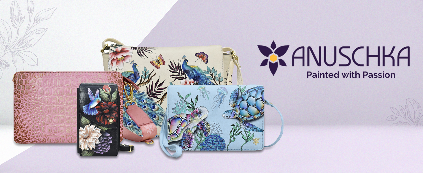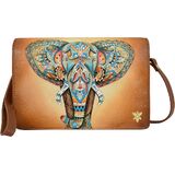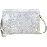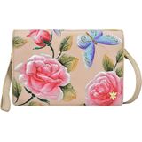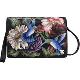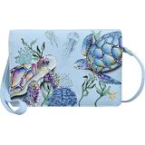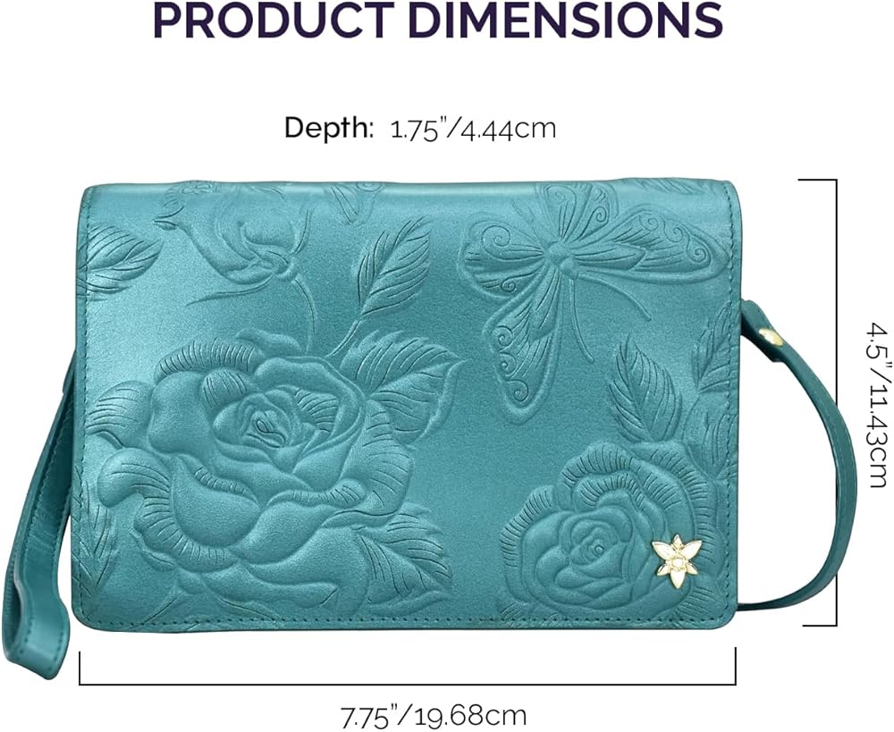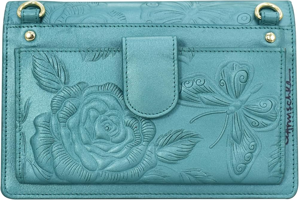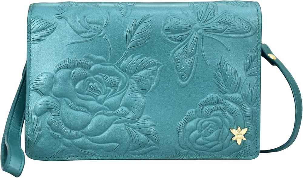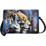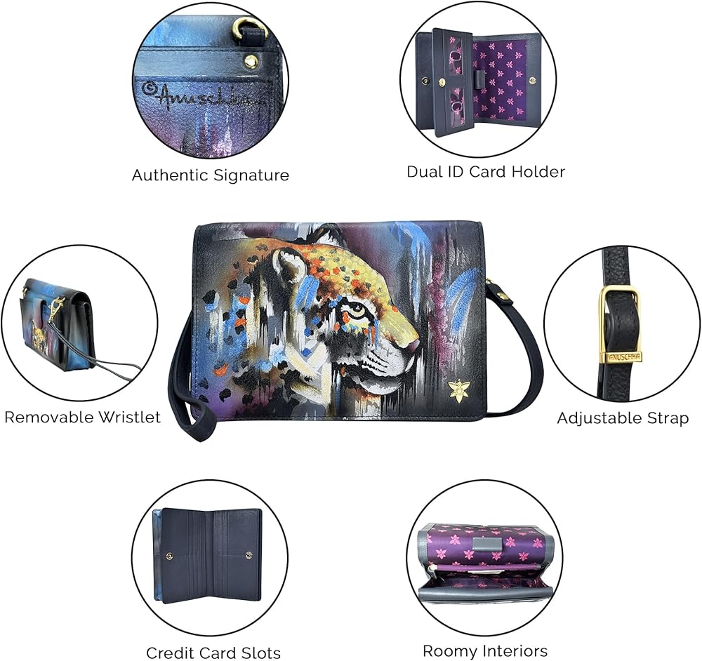Hand painted original artwork. Genuine leather exterior and trim. Flap with snap button entry. Fourteen RFID blocking card holders. One open compartment. Four slip-in pockets. One zippered wall pocket, two ID windows. Rear phone compartment with hook and loop fastener. Strap: Removable wristlet with 6" drop. Removable crossbody strap with maximum drop of 26".