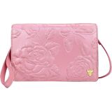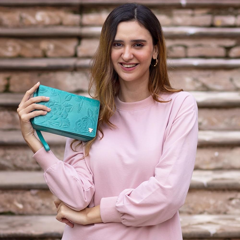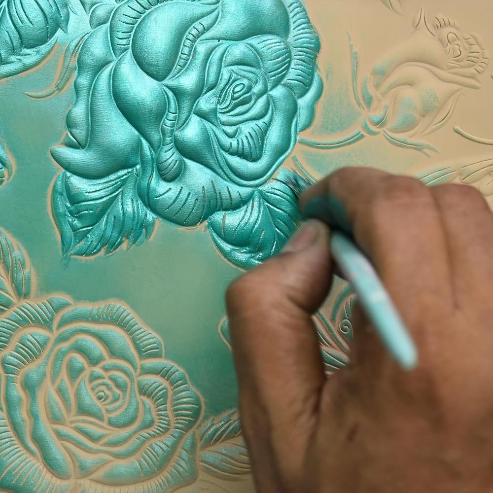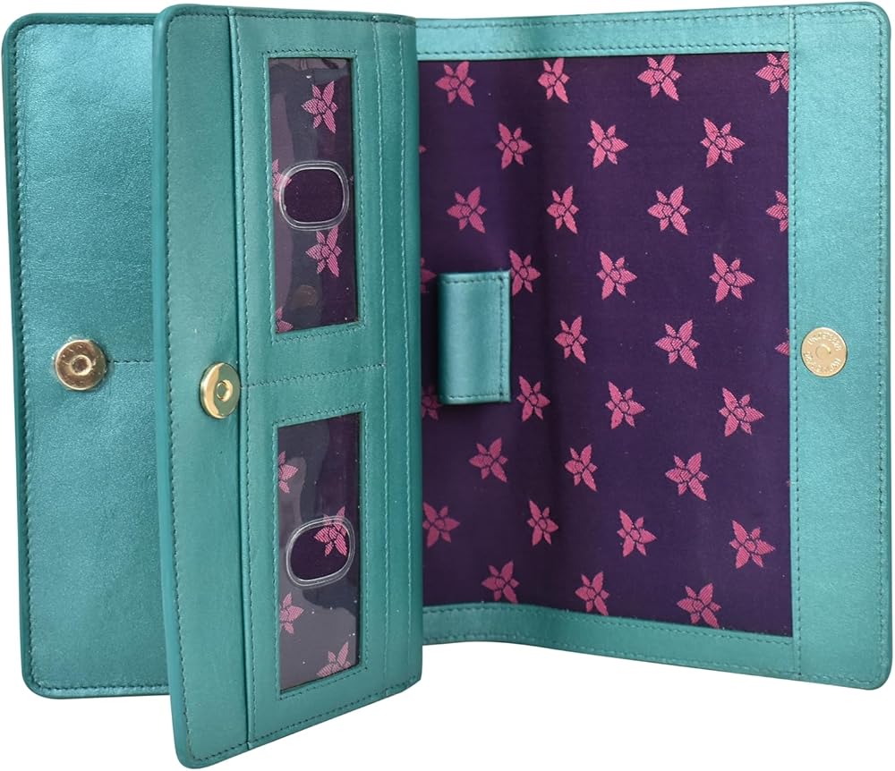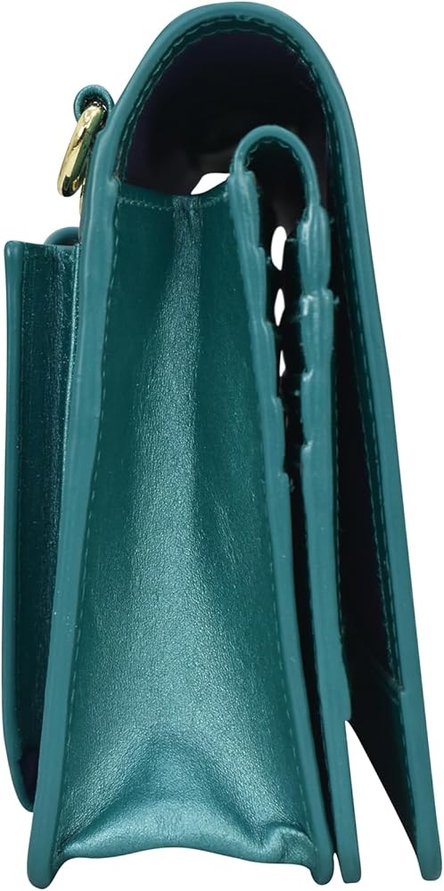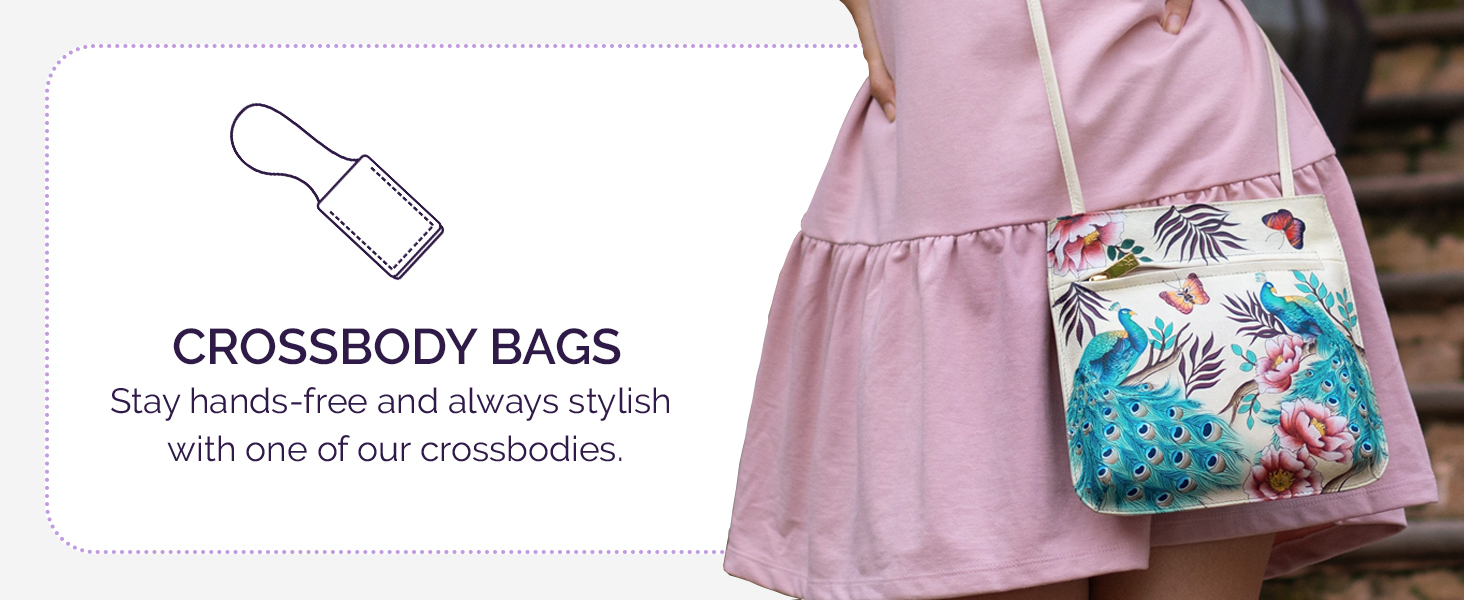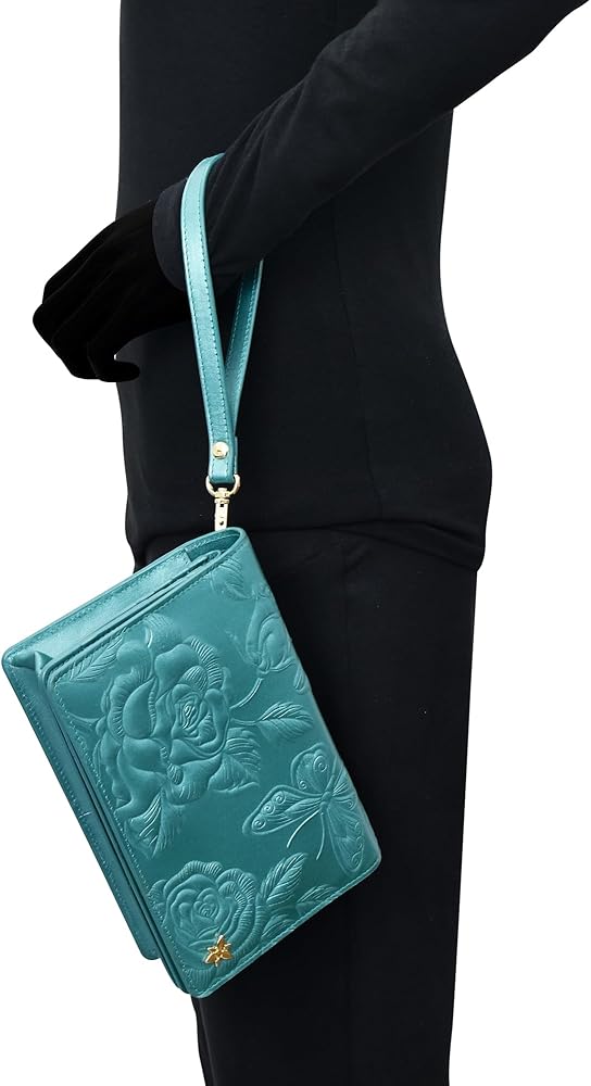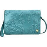 Hand painted original artwork. Genuine leather exterior and trim. Flap with snap button entry. Fourteen RFID blocking card holders. One open compartment. Four slip-in pockets. One zippered wall pocket, two ID windows. Rear phone compartment with hook and loop fastener. Strap: Removable wristlet with 6" drop. Removable crossbody strap with maximum drop of 26".