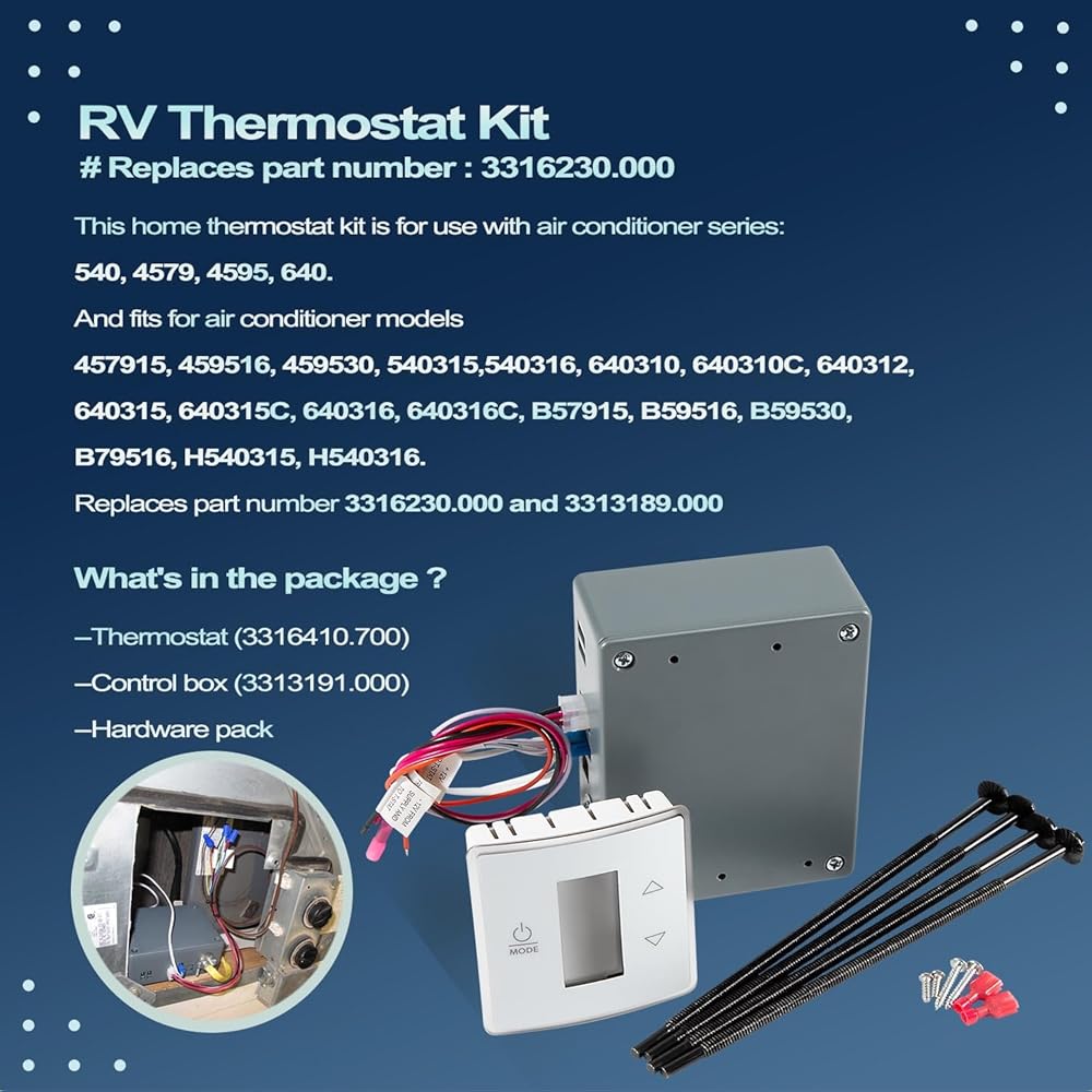 مجموعة ترموستات RV (3316230.000) تناسب ترموستات مكيف الهواء LCD الذي يعمل باللمس RV لمنطقة واحدة محلية مع مجموعة تحكم، لأوضاع التبريد/الفرن 3316410.700
