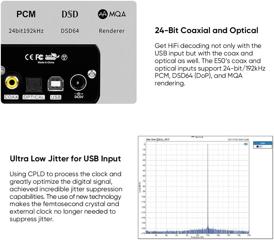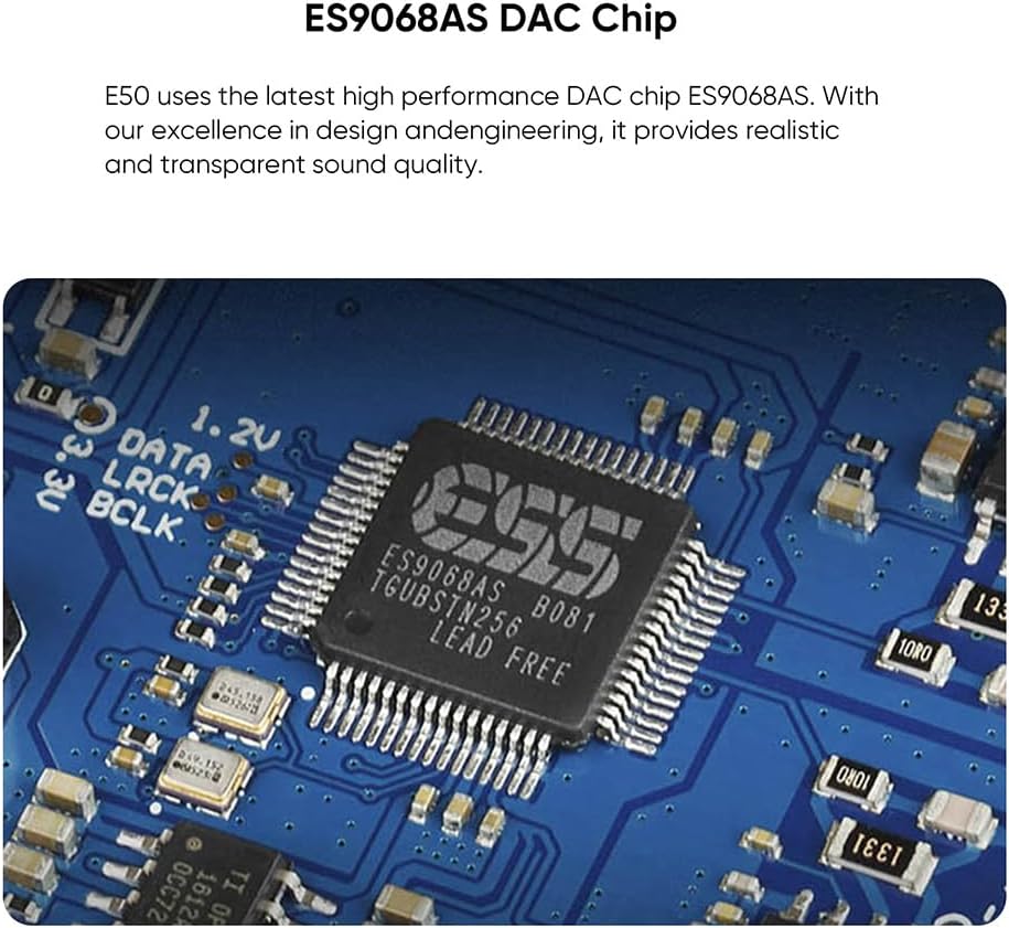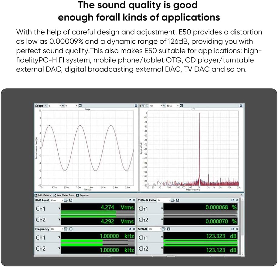 【جودة صوت جيدة】بمساعدة التصميم والتعديل الدقيق، يوفر E50 تشويهًا منخفضًا يصل إلى 0.00009% ونطاق ديناميكي يبلغ 126 ديسيبل، مما يوفر لك جودة صوت مثالية. وهذا أيضًا يجعل E50 مناسبًا للتطبيقات: نظام PC-HIFI عالي الدقة، والهاتف المحمول/الكمبيوتر اللوحي OTG، ومشغل الأقراص المضغوطة/DAC الخارجي القرص الدوار، وDAC الخارجي للبث الرقمي. تلفزيون DAC وما إلى ذلك.