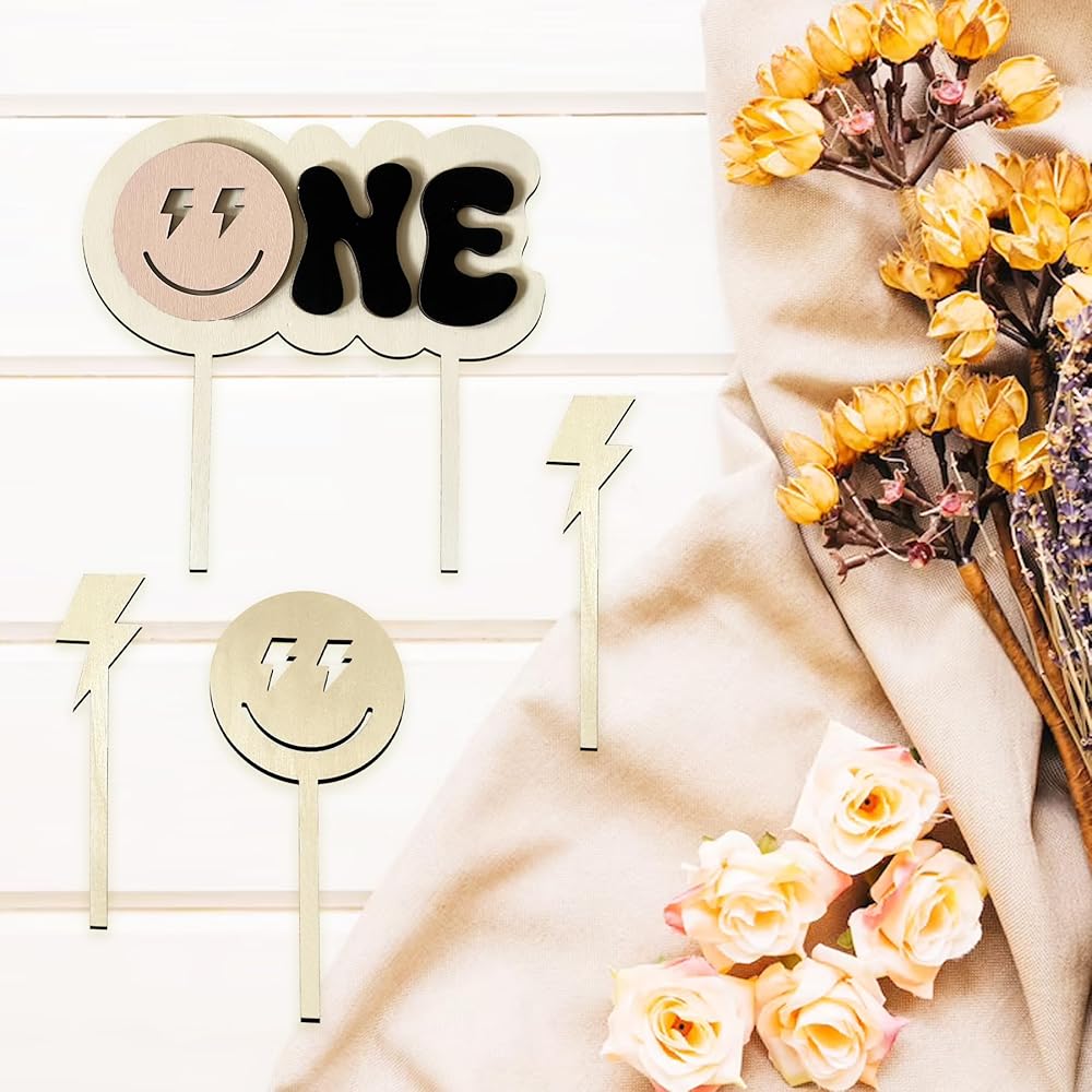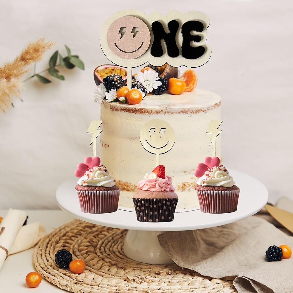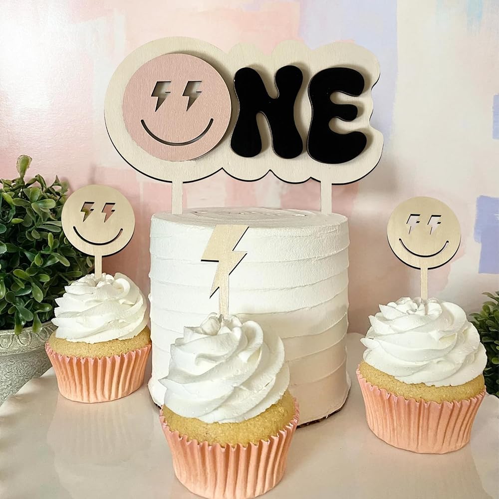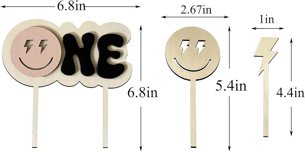 Size and Material:The wooden one Happy Dude 1st Birthday Cake Topper size is 6.8*6.8 inches,wooden Lightning Cupcake Topper size is 4.4*1in,the smiley face cupcake topper size is 5.4*2.7in.Our rustic wooden cake toppers is made of high-quality wood surface carving processing, there is a slight burn on the edge of the design,Because it is made of natural wood, each cake topper retains a clear wood grain,log color wooden sign suitable for any color cake selection.