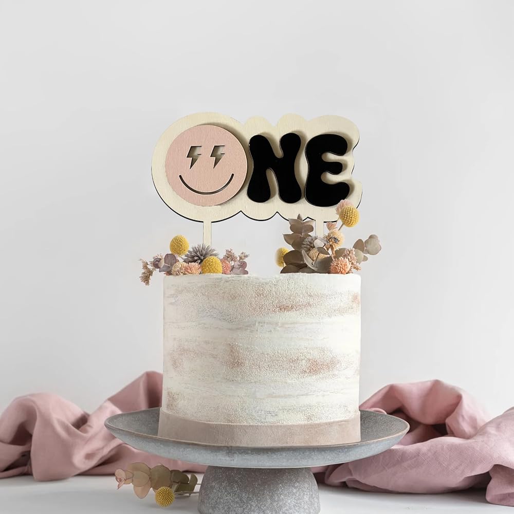 One Happy Dude Cake Toppers for 1st Birthday Decorations,Wooden Smiley Face Cupcake Topper One Cool Dude Cake Topper for Hippie First Birthday Decoration Groovy One Birthday Props