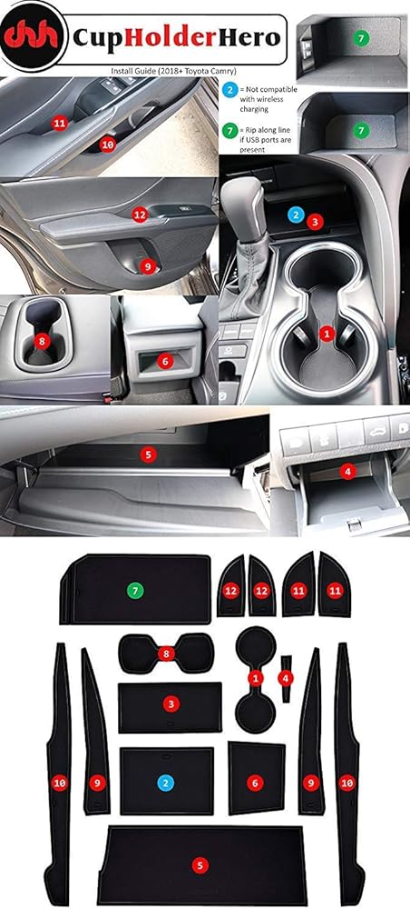 ✅الجزء الداخلي الخاص بك مغطى - سجادات الأرضية وأغطية المقاعد ليست كافية للحماية من جميع المواد اللزجة التي تنجذب إلى حاملات مشروبات السيارات ومناطق تخزين جيوب الأبواب. مجموعة السجادة الجديدة غير القابلة للانزلاق المكونة من 16 قطعة تحمي صينية الكونسول المركزي وجيوب الأبواب وحاملات الأكواب وتحافظ على طيران سيارتك. (يناسب موديلات Toyota Camry 2018,2019,2020,2021,2022,2023 و2024 بما في ذلك مستويات القطع: L، LE، SE، XLE، TRD وXSE. (لن تعمل حصيرة واحدة مع الشحن اللاسلكي! قد تكون بطانة صندوق القفازات كبيرة جدًا لبعض الديكورات)