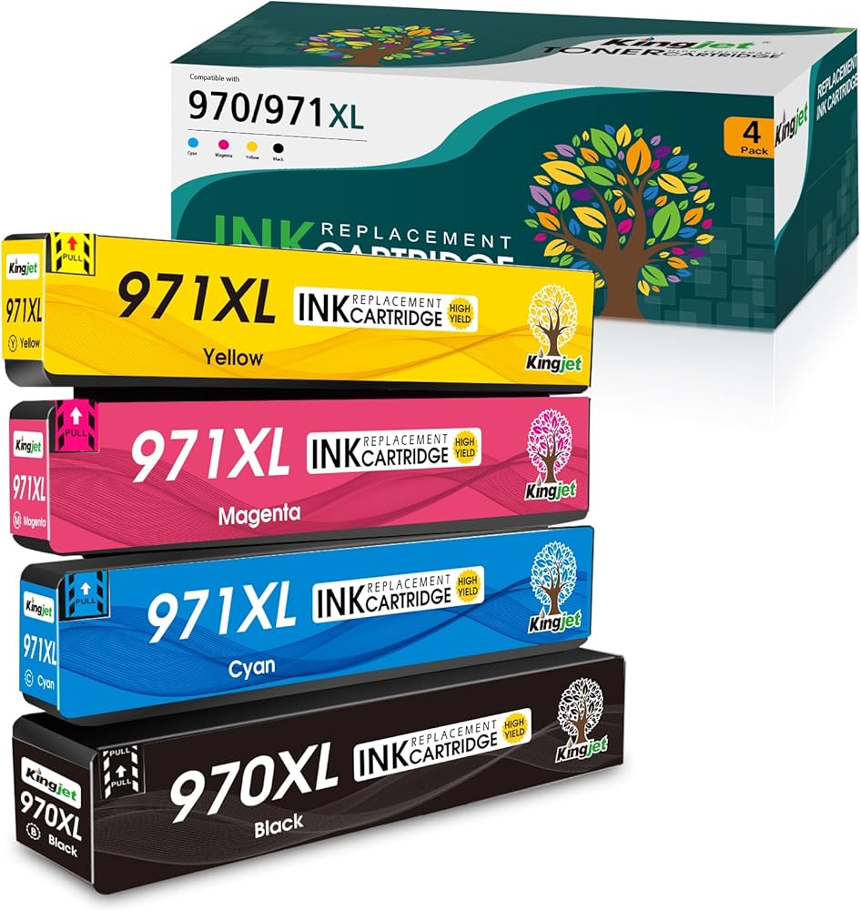 📦𝗣𝗮𝗰𝗸𝗮𝗴𝗲 𝗖𝗼𝗻𝘁𝗲𝗻𝘁𝘀: 1 × 970 970xl حبر أسود، 1 × 971 971xl حبر سماوي، 1 × 971 971xl حبر أرجواني، 1 × 9 71 حبر أصفر 971xl (إجمالي 4 خراطيش عالية الإنتاجية)، قطعة واحدة من التعليمات. خرطوشة حبر بديلة متوافقة عالية الإنتاجية لطابعات HP Ink 970 و971.