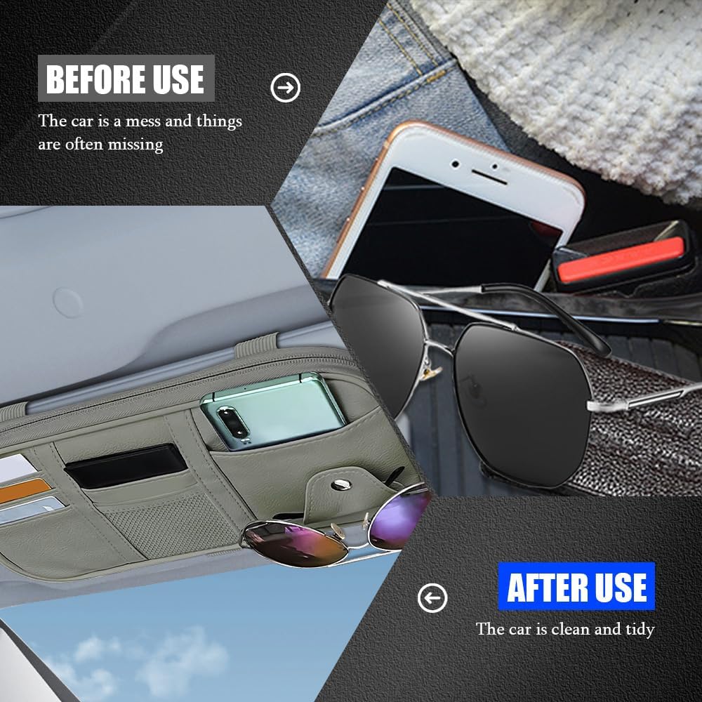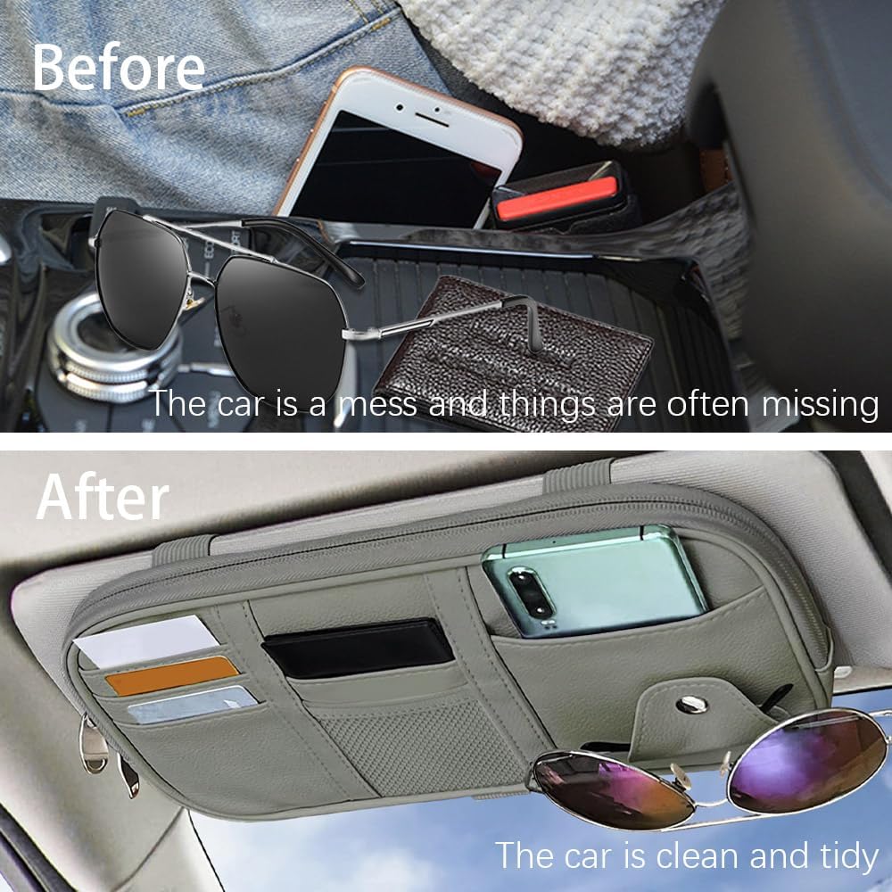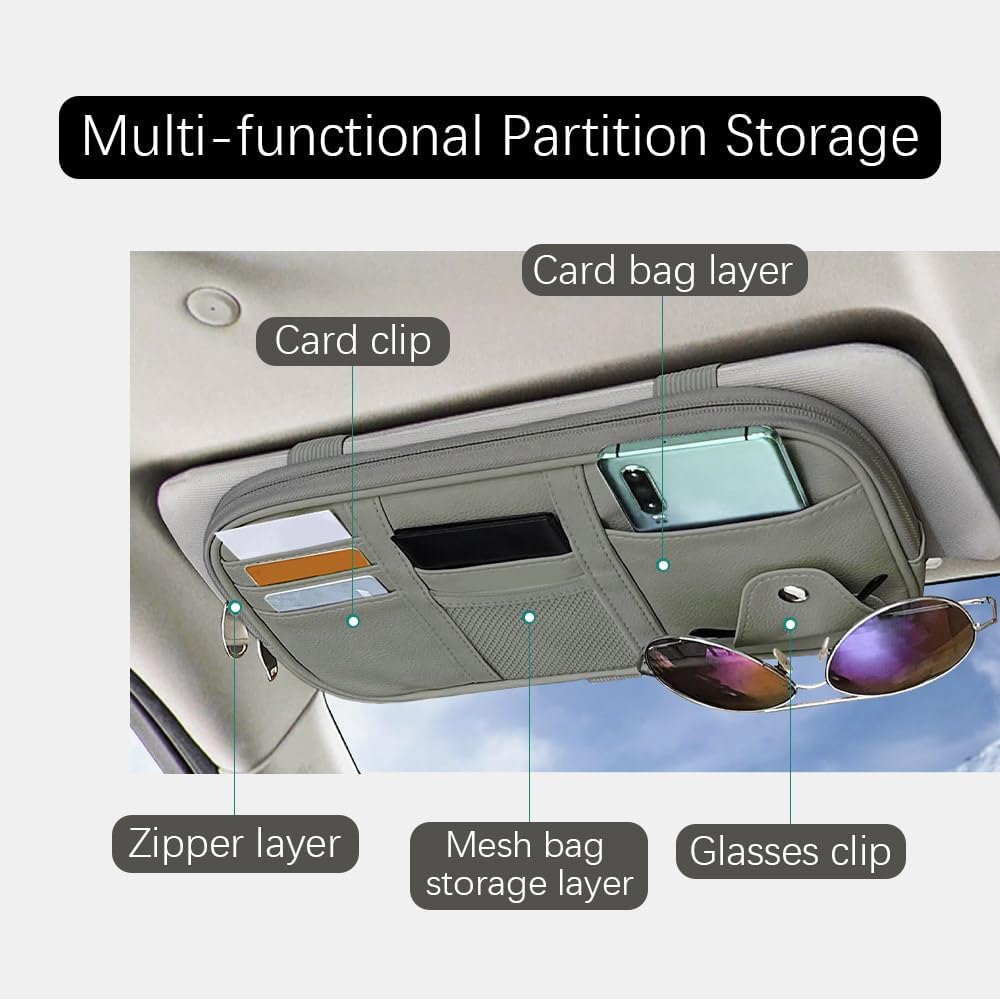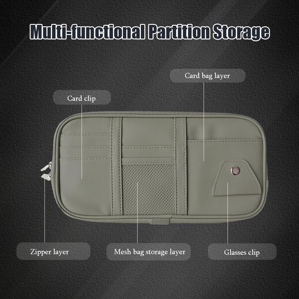 [Multi-functional partition storage design]: This Car Visor Storage Bag has a zipper layer, card holder, net bag storage layer, card cladding, glasses clip and other multi-functional storage area. The interior also has a zipper layer storage design, and the large storage space coupled with the partition design can allow you to store a lot of things and keep your car neat and clean.