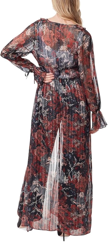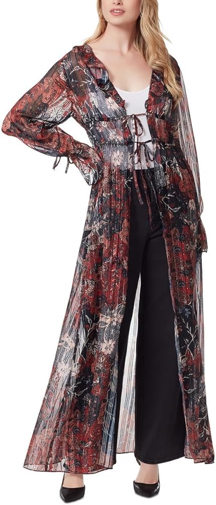 Layer up with feminine flair featured in the floral print, ruffle detail, and sheer design of this Jessica Simpson duster top.