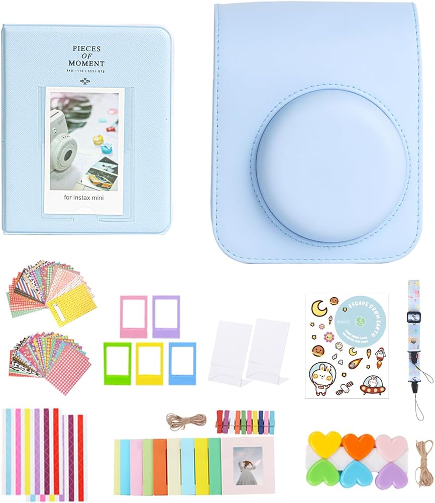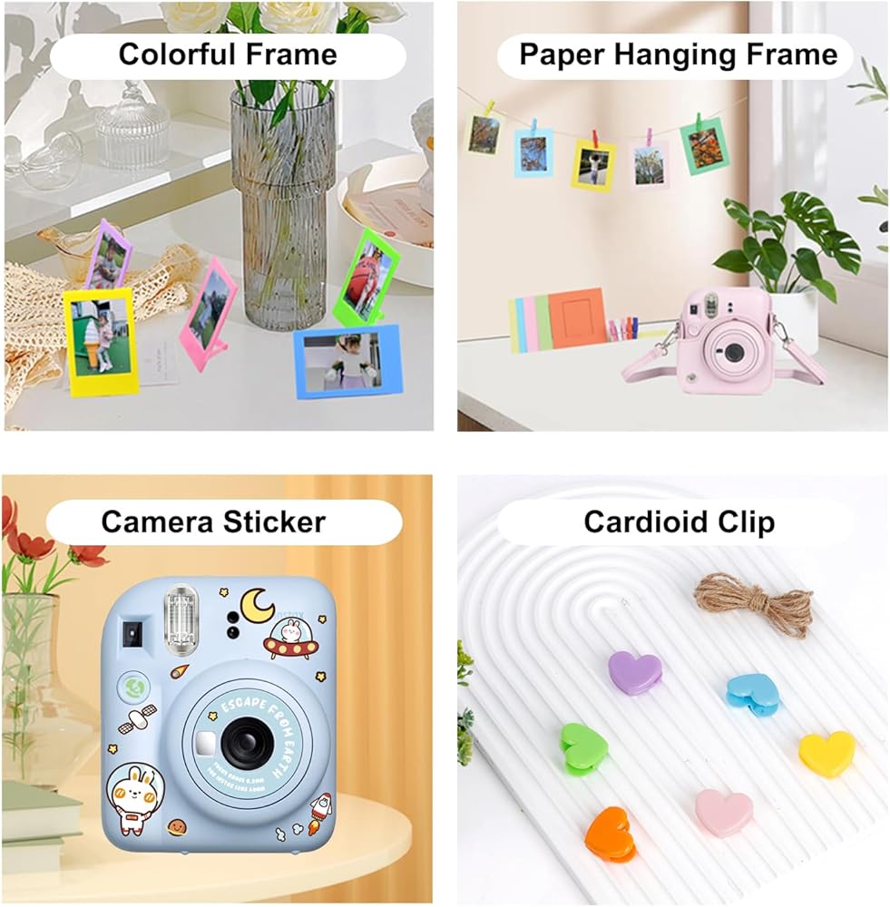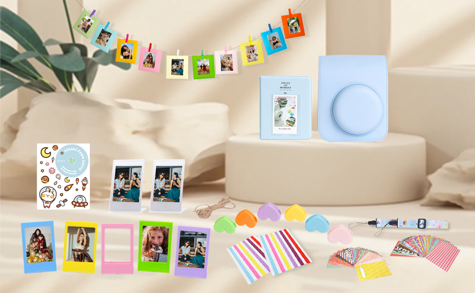 【ما تحصل عليه】: تتضمن حزم الكاميرا الصغيرة المكونة من 12 حقيبة كاميرا مع حزام ×1؛ ألبوم صور 64 جيبًا ×1؛ ملصقات حدود الفيلم x40؛ ملصق الكاميرا ×1؛ إطار صورة صغير ملون ×5؛ إطارات معلقة على الحائط × 10؛ إطار طاولة كبير × 2؛ حزام كاميرا كرتوني ×1؛ ملصق زاوية ×2؛ مشبك قلبي ×6. ملحقات مثالية لـ instax mini 12. (ملاحظة: الكاميرا غير متضمنة)