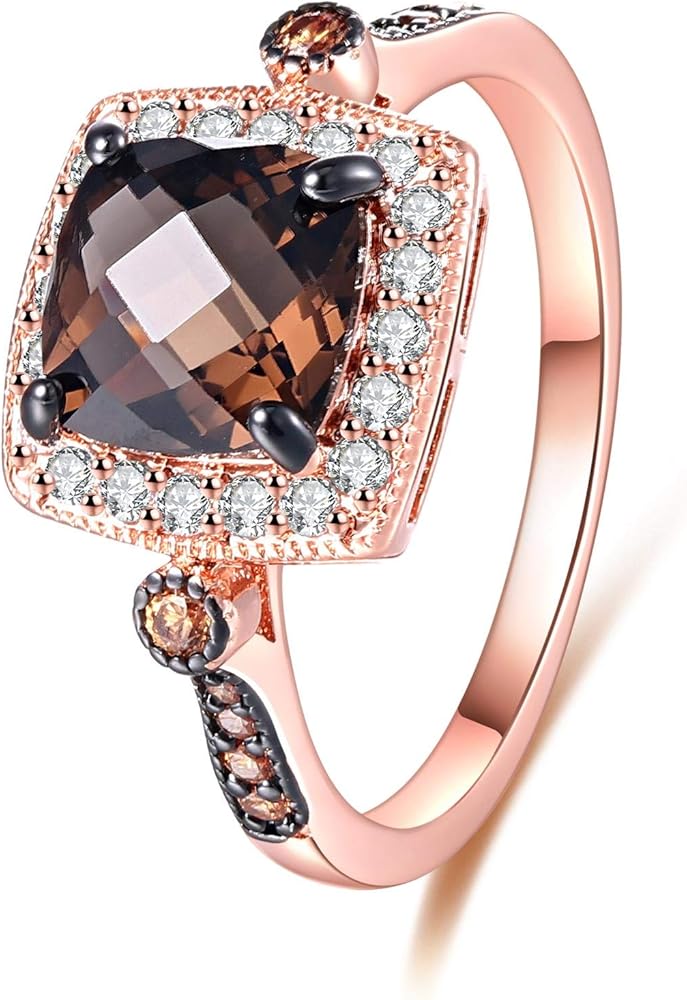 • Design: Rose gold plated ring featuring created smoke topaz and morganite stones.