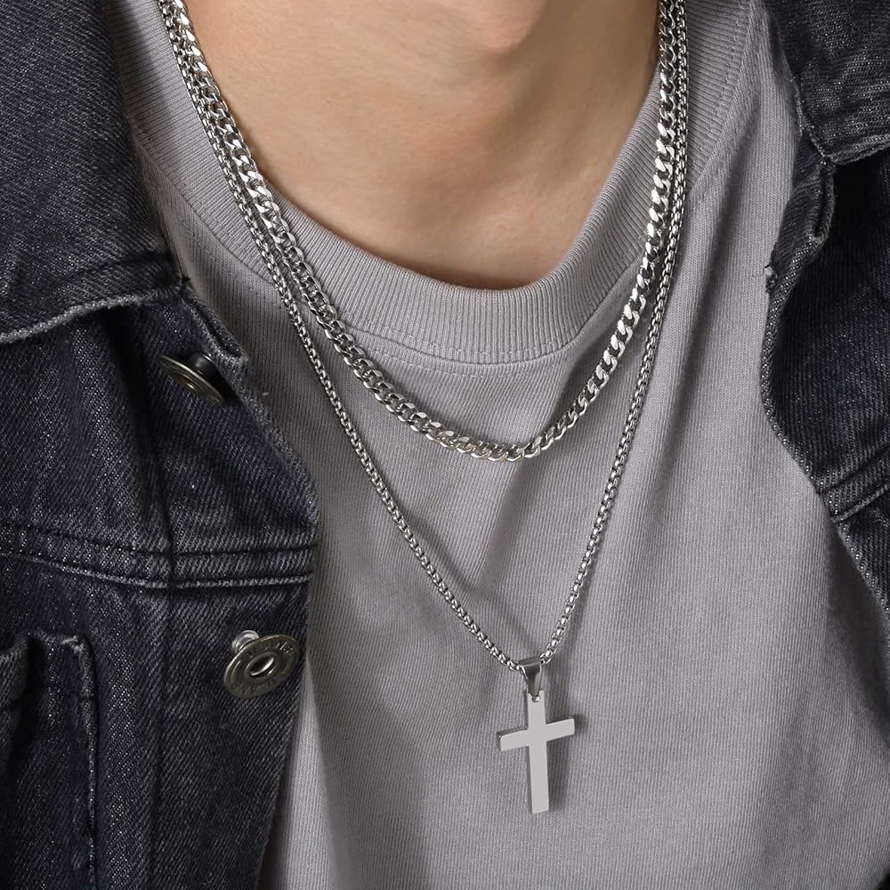 * Layered Cross Necklace Size * Mens Cross chain length 20/22''.2Pcs Layered necklace,cuban chain and box chain cross necklace. Fashion originates from classics, minimalism design, Different chains allow you to match clothes for various occasions.