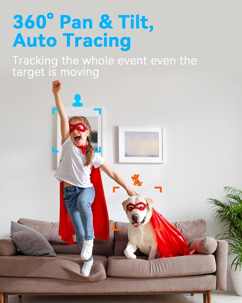 Pan & Tilt & Zoom & Patrol 📸 عدسة محسّنة بزاوية 105 درجة FOV مدمجة مع نطاق دوران أفقي 355 درجة و180 درجة عموديًا تلتقط تغطية كاملة للعرض بزاوية 360 درجة وتكبير رقمي 4X للتكبير للحصول على التفاصيل بوضوح. 👮♀️ وضع الدورية التلقائي يزيد من سلامة المنطقة بأكملها.
