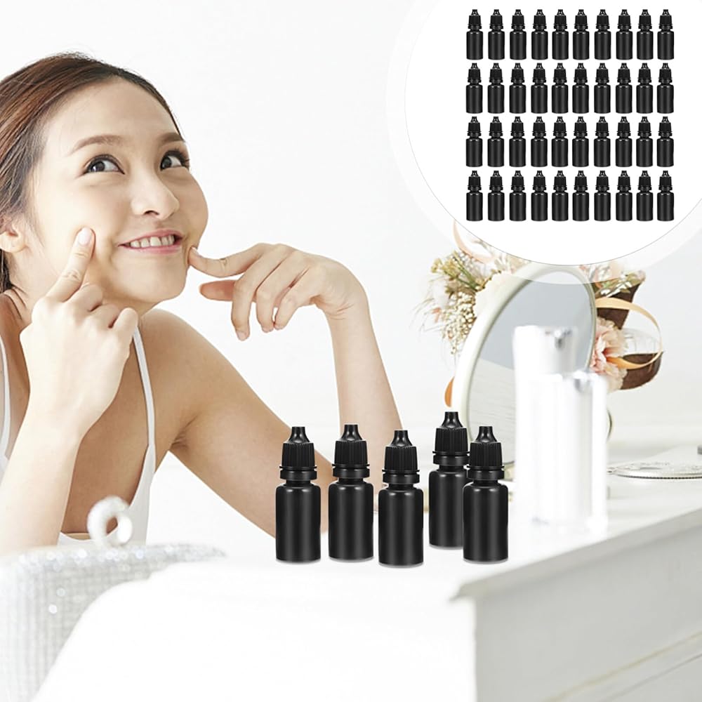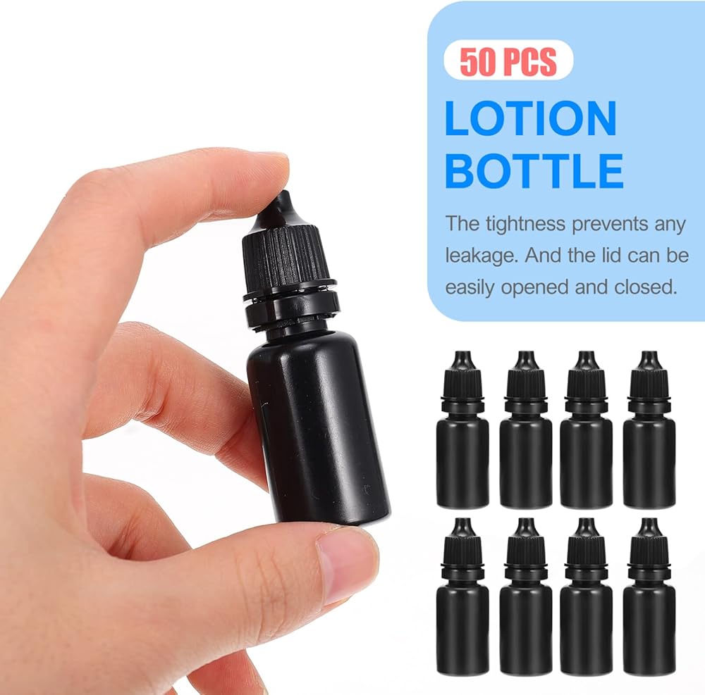 SOLUSTRE 50 قطعة 10 مل زجاجات قطارة فارغة قابلة للضغط من الزيوت العطرية، حاويات قابلة لإعادة الملء، زجاجات قطارة سائلة للعين مع أغطية