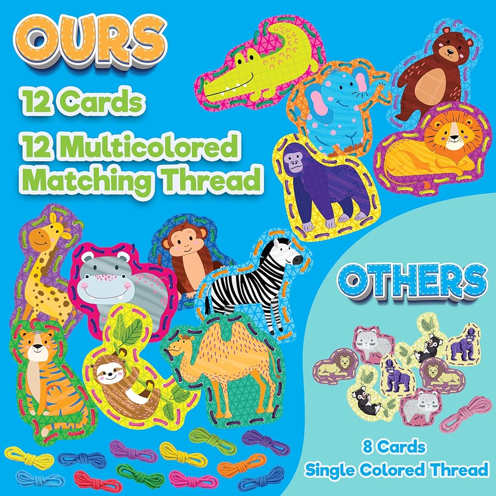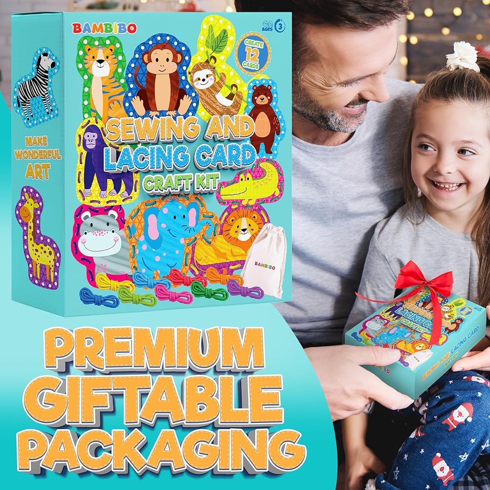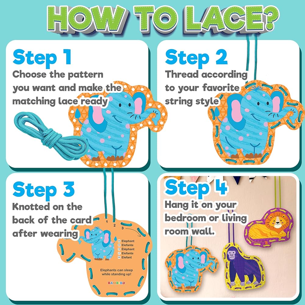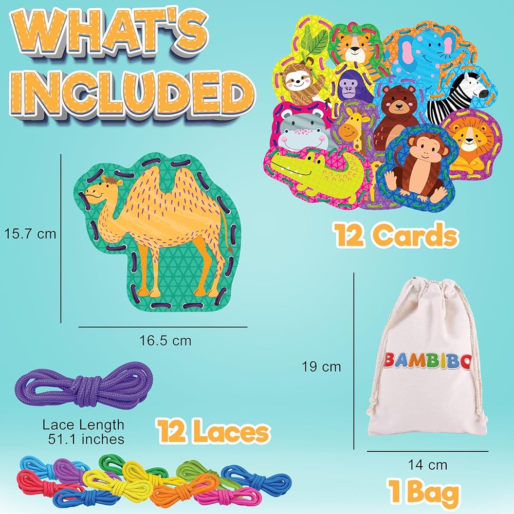 مجموعة بطاقات جلد بامبيبو للفنون والحرف اليدوية للأطفال - عبوة من 12 قطعة | وجهين مع الأسماء والميزات | بطاقات الحيوانات والخياطة للأطفال من عمر 4 إلى 8 سنوات | 12 لعبة خيطية ملونة للأطفال الصغار من عمر 3 4 5 6