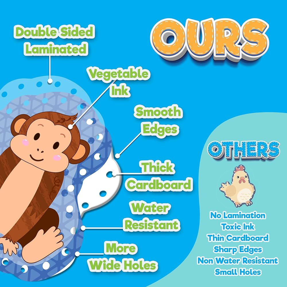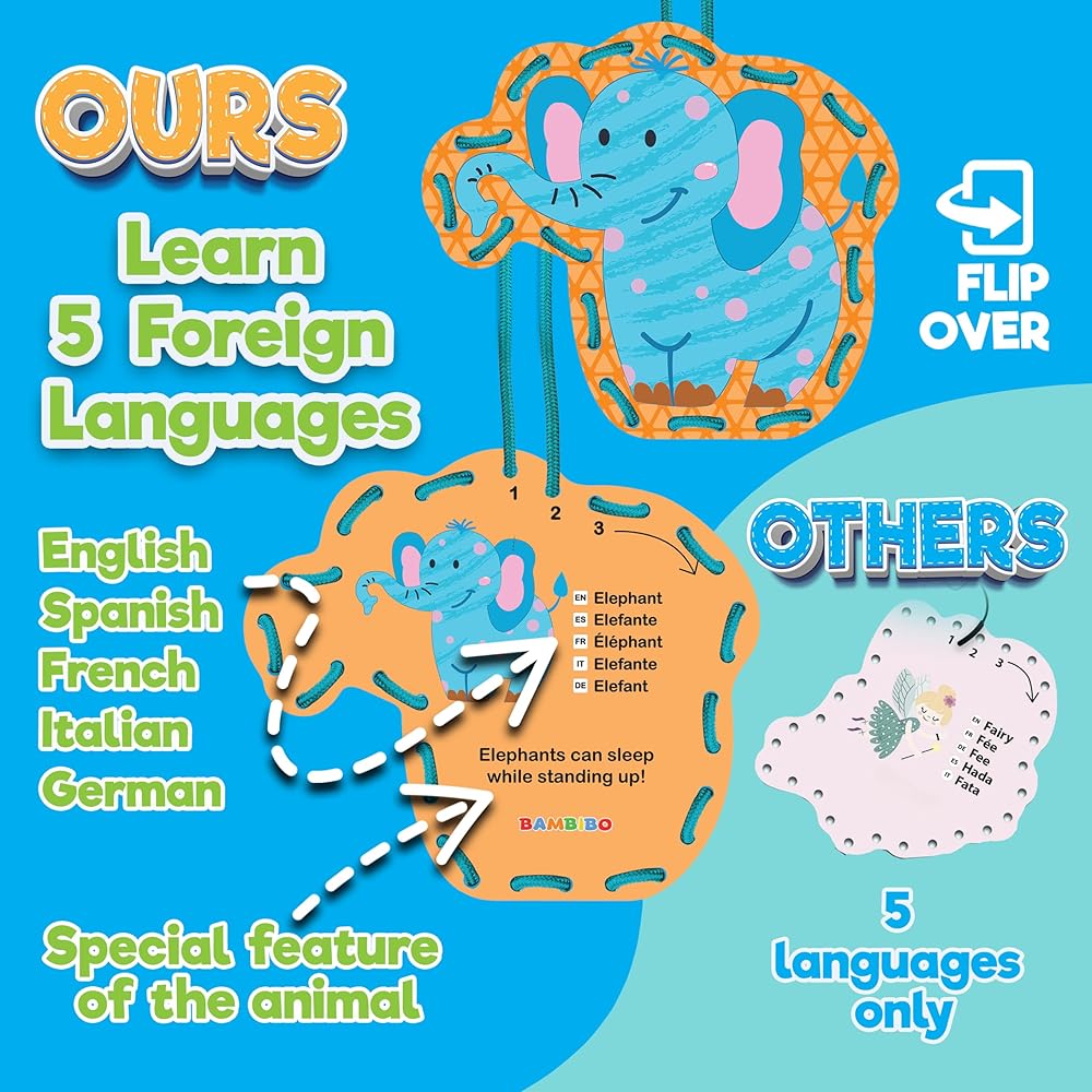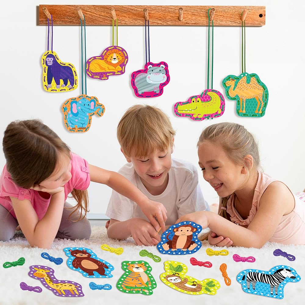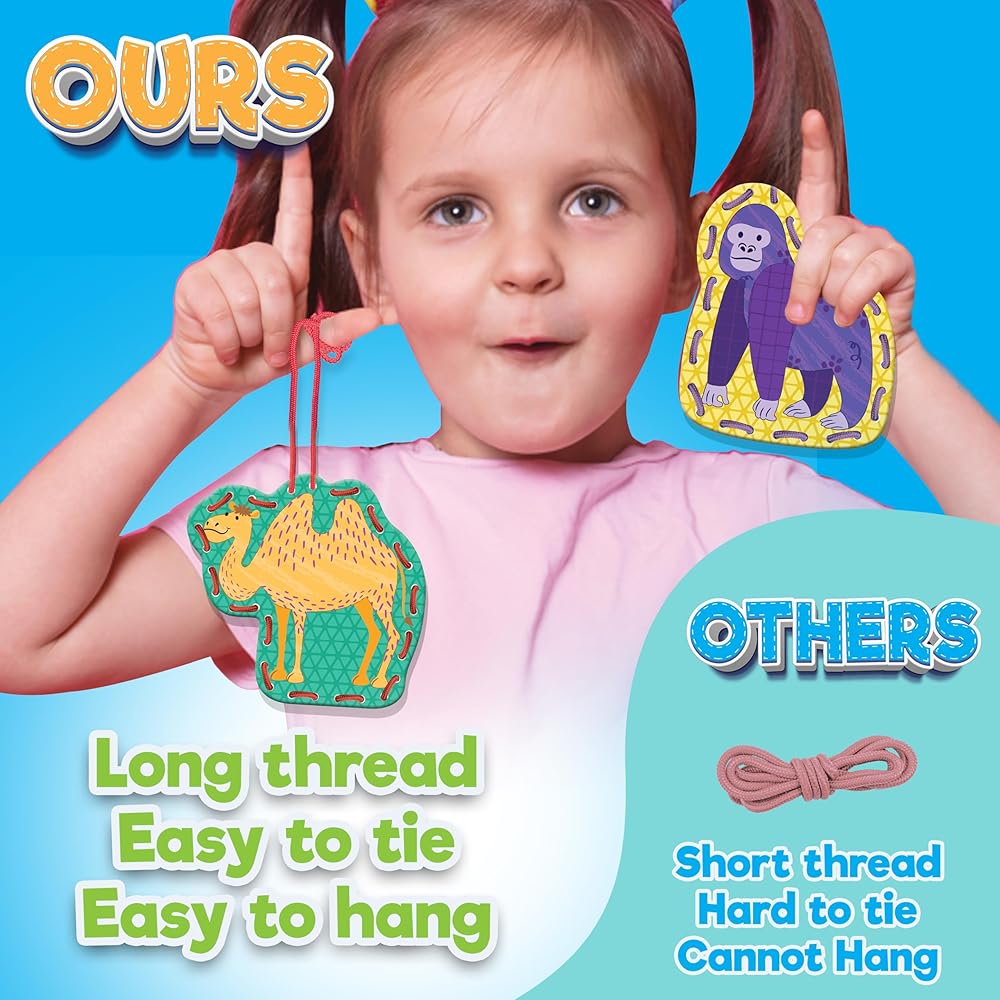 مجموعة بطاقات جلد بامبيبو للفنون والحرف اليدوية للأطفال - عبوة من 12 قطعة | وجهين مع الأسماء والميزات | بطاقات الحيوانات والخياطة للأطفال من عمر 4 إلى 8 سنوات | 12 لعبة خيطية ملونة للأطفال الصغار من عمر 3 4 5 6