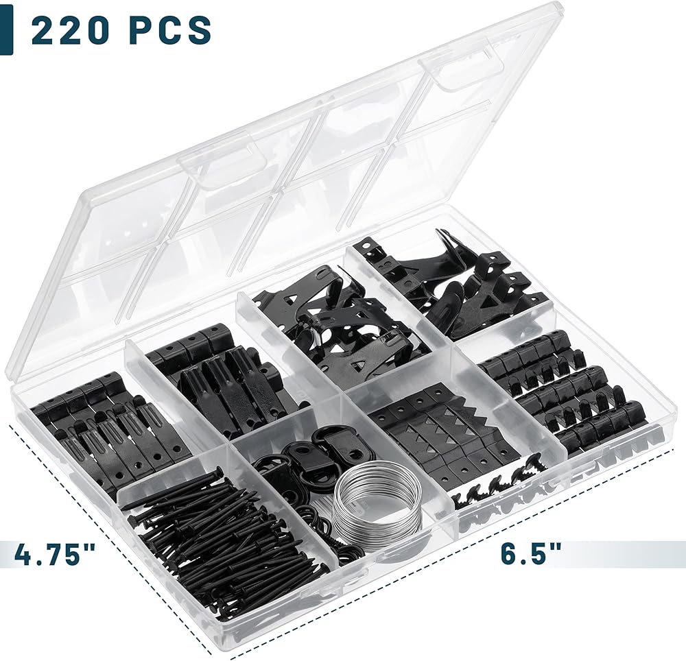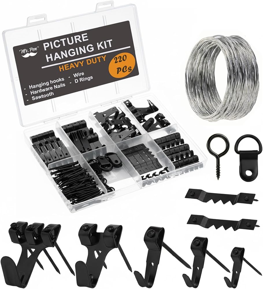 Mr. Pen picture hanging kit contains 220 pcs of accessories, including wires, hooks, nails, and other hardware components packaged in a hard, safe box for easy storage.