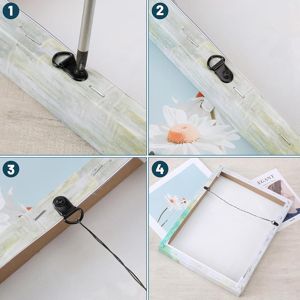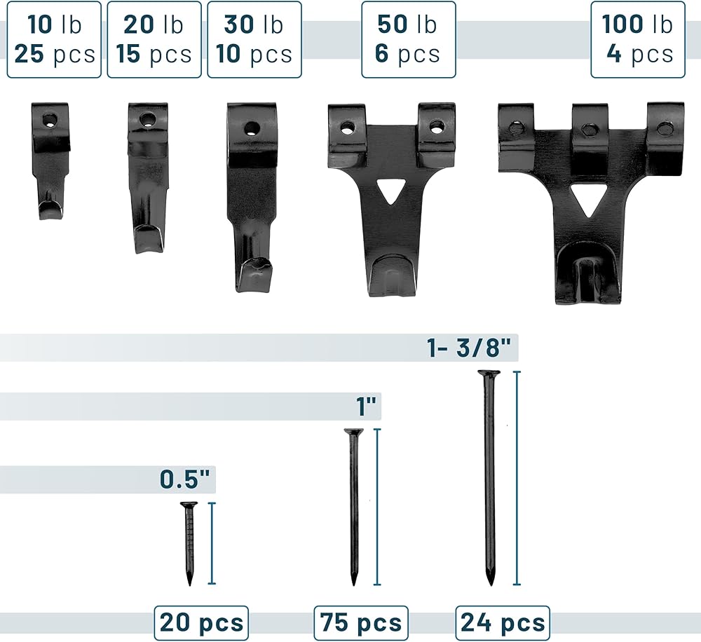 It is equipped with heavy-duty picture hanger hooks that are rated at 10lb, 20lb, 30lb, 50lb, and 100lbs making it suitable for hanging artwork of various sizes.