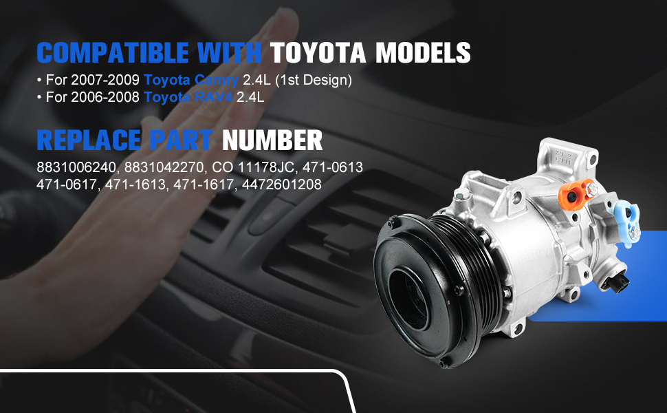 • 【الملاءمة】يتوافق ضاغط تكييف الهواء مع Toyota Camry 2.4L 2007-2009 (التصميم الأول)، وRAV4 2.4L 2006-2008 FWD GAS