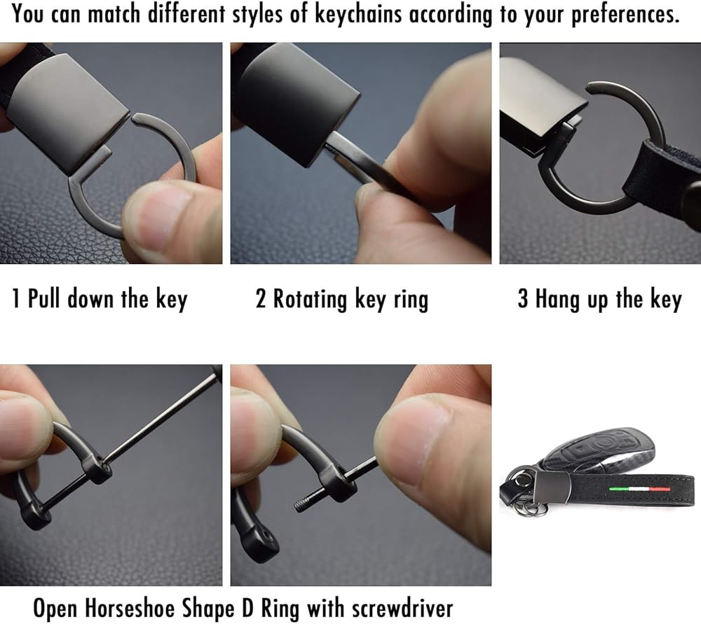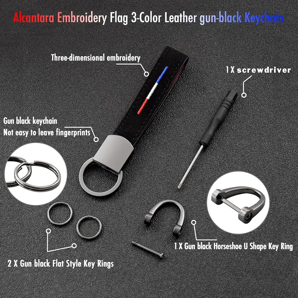 1 X جلد ألكانتارا + سلسلة مفاتيح معدنية من سبيكة معدنية بلمسة نهائية من الكروم باللون الأسود؛ 2 X حلقة مفاتيح صغيرة من سبيكة معدنية بلمسة نهائية من الكروم باللون الأسود؛ 1 X حلقة معدنية على شكل حدوة حصان من سبيكة معدنية بلمسة نهائية من الكروم باللون الأسود؛ 1 X مفك براغي صغير